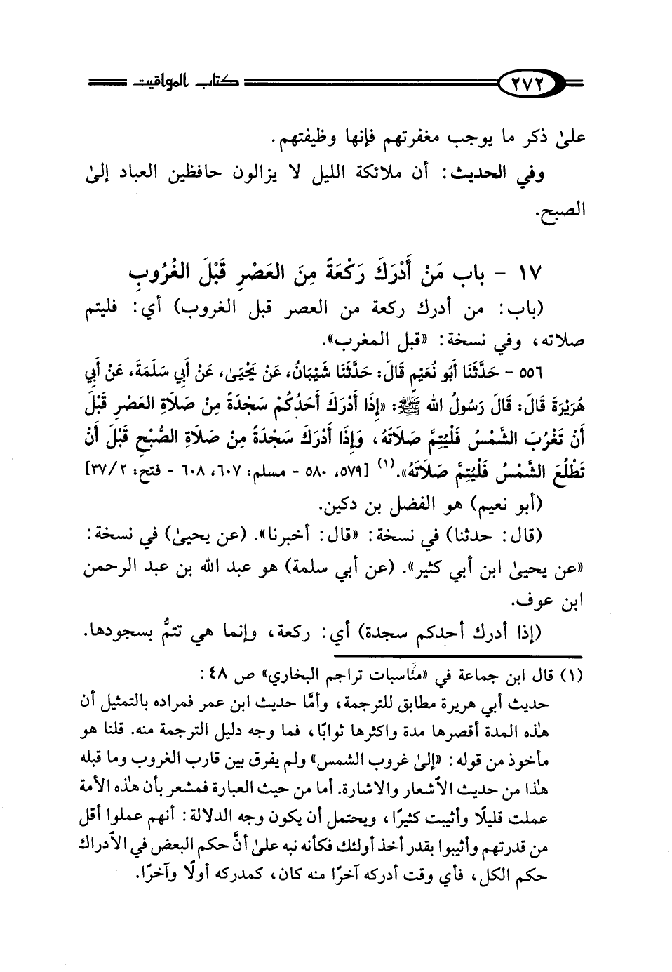 556 - حَدَّثَنَا أَبُو نُعَيْمٍ، قَالَ: حَدَّثَنَا شَيْبَانُ، عَنْ يَحْيَى بْنِ أَبِي كَثِيرٍ، عَنْ أَبِي سَلَمَةَ، عَنْ أَبِي هُرَيْرَةَ، قَالَ: قَالَ رَسُولُ اللَّهِ صَلَّى اللهُ عَلَيْهِ وَسَلَّمَ: "إِذَا أَدْرَكَ أَحَدُكُمْ سَجْدَةً مِنْ صَلاةِ العَصْرِ، قَبْلَ أَنْ تَغْرُبَ الشَّمْسُ، فَلْيُتِمَّ صَلاتَهُ، وَإِذَا أَدْرَكَ سَجْدَةً مِنْ صَلاةِ الصُّبْحِ، قَبْلَ أَنْ تَطْلُعَ الشَّمْسُ، فَلْيُتِمَّ صَلاتَهُ". (¬1) [579، 580 - مسلم: 607، 608 - فتح: 2/ 37]