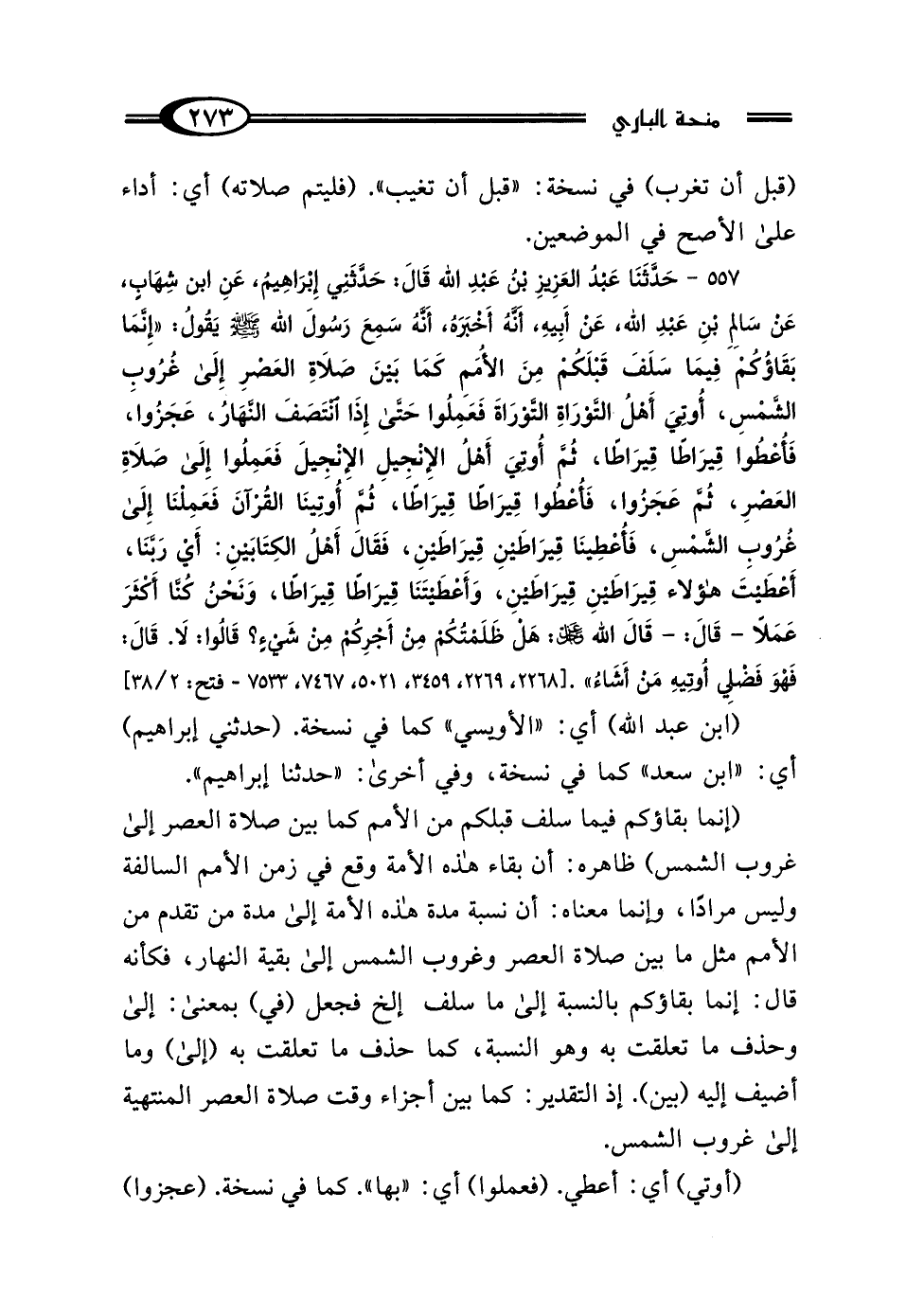 557 - حَدَّثَنَا عَبْدُ العَزِيزِ بْنُ عَبْدِ اللَّهِ الأُوَيْسِيُّ، قَالَ: حَدَّثَنِي إِبْرَاهِيمُ بْنُ سَعْدٍ، عَنِ ابْنِ شِهَابٍ، عَنْ سَالِمِ بْنِ عَبْدِ اللَّهِ، عَنْ أَبِيهِ، أَنَّهُ أَخْبَرَهُ أَنَّهُ سَمِعَ رَسُولَ اللَّهِ صَلَّى اللهُ عَلَيْهِ وَسَلَّمَ، يَقُولُ: "إِنَّمَا بَقَاؤُكُمْ فِيمَا سَلَفَ قَبْلَكُمْ مِنَ الأُمَمِ كَمَا بَيْنَ صَلاةِ العَصْرِ إِلَى غُرُوبِ الشَّمْسِ، أُوتِيَ أَهْلُ التَّوْرَاةِ التَّوْرَاةَ، فَعَمِلُوا حَتَّى إِذَا انْتَصَفَ النَّهَارُ عَجَزُوا، فَأُعْطُوا قِيرَاطًا قِيرَاطًا، ثُمَّ أُوتِيَ أَهْلُ الإِنْجِيلِ الإِنْجِيلَ، فَعَمِلُوا إِلَى صَلاةِ العَصْرِ، ثُمَّ عَجَزُوا، فَأُعْطُوا قِيرَاطًا قِيرَاطًا، ثُمَّ أُوتِينَا القُرْآنَ، فَعَمِلْنَا إِلَى غُرُوبِ الشَّمْسِ، فَأُعْطِينَا قِيرَاطَيْنِ قِيرَاطَيْنِ، فَقَالَ: أَهْلُ الكِتَابَيْنِ: أَيْ رَبَّنَا، أَعْطَيْتَ هَؤُلاءِ قِيرَاطَيْنِ قِيرَاطَيْنِ، وَأَعْطَيْتَنَا قِيرَاطًا قِيرَاطًا، وَنَحْنُ كُنَّا أَكْثَرَ عَمَلًا؟ قَالَ: قَالَ اللَّهُ عَزَّ وَجَلَّ: هَلْ ظَلَمْتُكُمْ مِنْ أَجْرِكُمْ مِنْ شَيْءٍ؟ قَالُوا: لَا، قَالَ: فَهُوَ فَضْلِي أُوتِيهِ مَنْ أَشَاءُ".