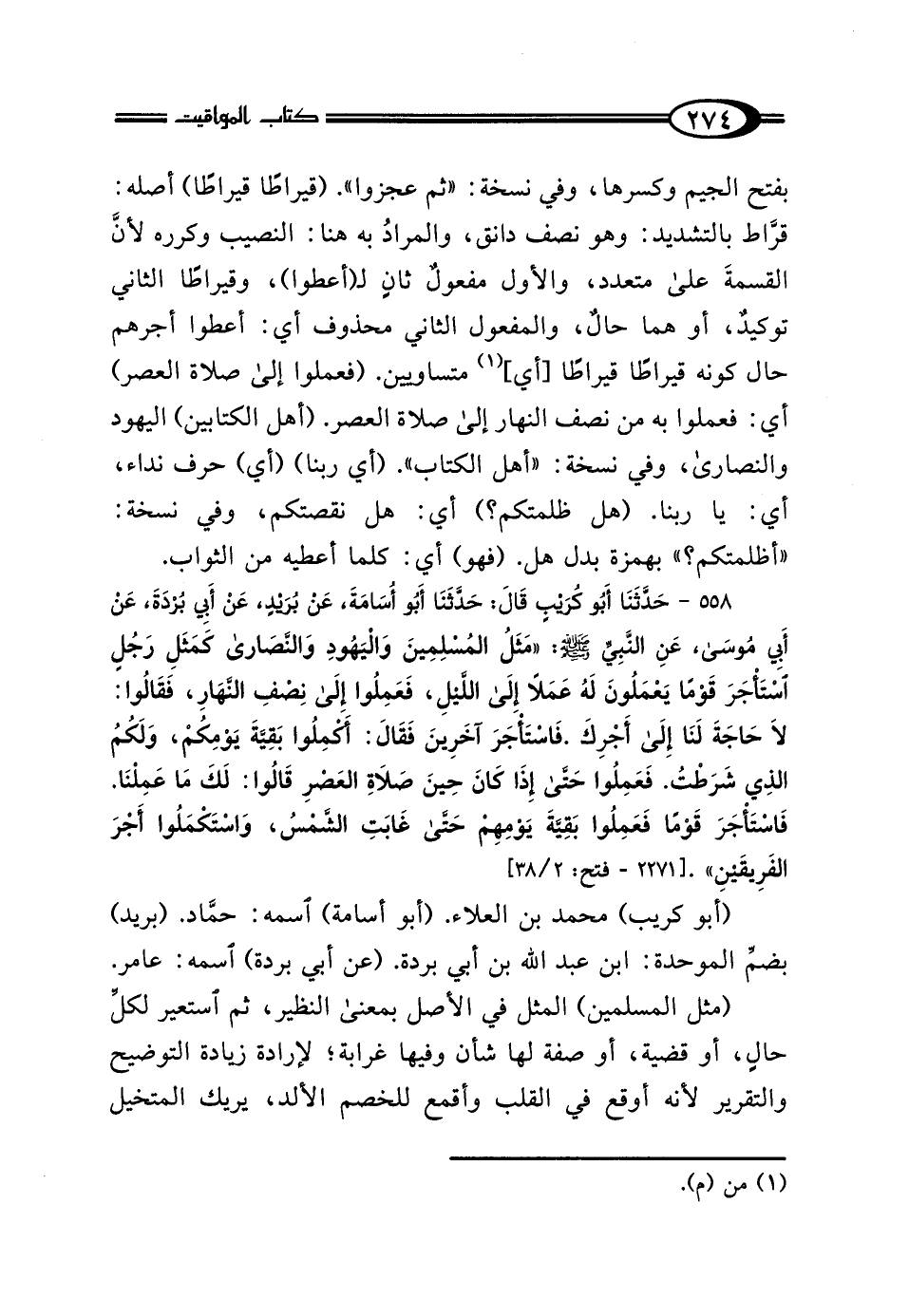 558 - حَدَّثَنَا أَبُو كُرَيْبٍ، قَالَ: حَدَّثَنَا أَبُو أُسَامَةَ، عَنْ بُرَيْدٍ، عَنْ أَبِي بُرْدَةَ، عَنْ أَبِي مُوسَى، عَنِ النَّبِيِّ صَلَّى اللهُ عَلَيْهِ وَسَلَّمَ: "مَثَلُ المُسْلِمِينَ وَاليَهُودِ وَالنَّصَارَى، كَمَثَلِ رَجُلٍ اسْتَأْجَرَ قَوْمًا، يَعْمَلُونَ لَهُ عَمَلًا إِلَى اللَّيْلِ، فَعَمِلُوا إِلَى نِصْفِ النَّهَارِ فَقَالُوا: لَا حَاجَةَ لَنَا إِلَى أَجْرِكَ، فَاسْتَأْجَرَ آخَرِينَ، فَقَالَ: أَكْمِلُوا بَقِيَّةَ يَوْمِكُمْ وَلَكُمُ الَّذِي شَرَطْتُ، فَعَمِلُوا حَتَّى إِذَا كَانَ حِينَ صَلاةِ العَصْرِ، قَالُوا: لَكَ مَا عَمِلْنَا، فَاسْتَأْجَرَ قَوْمًا، فَعَمِلُوا بَقِيَّةَ يَوْمِهِمْ حَتَّى غَابَتِ الشَّمْسُ، وَاسْتَكْمَلُوا أَجْرَ الفَرِيقَيْنِ".