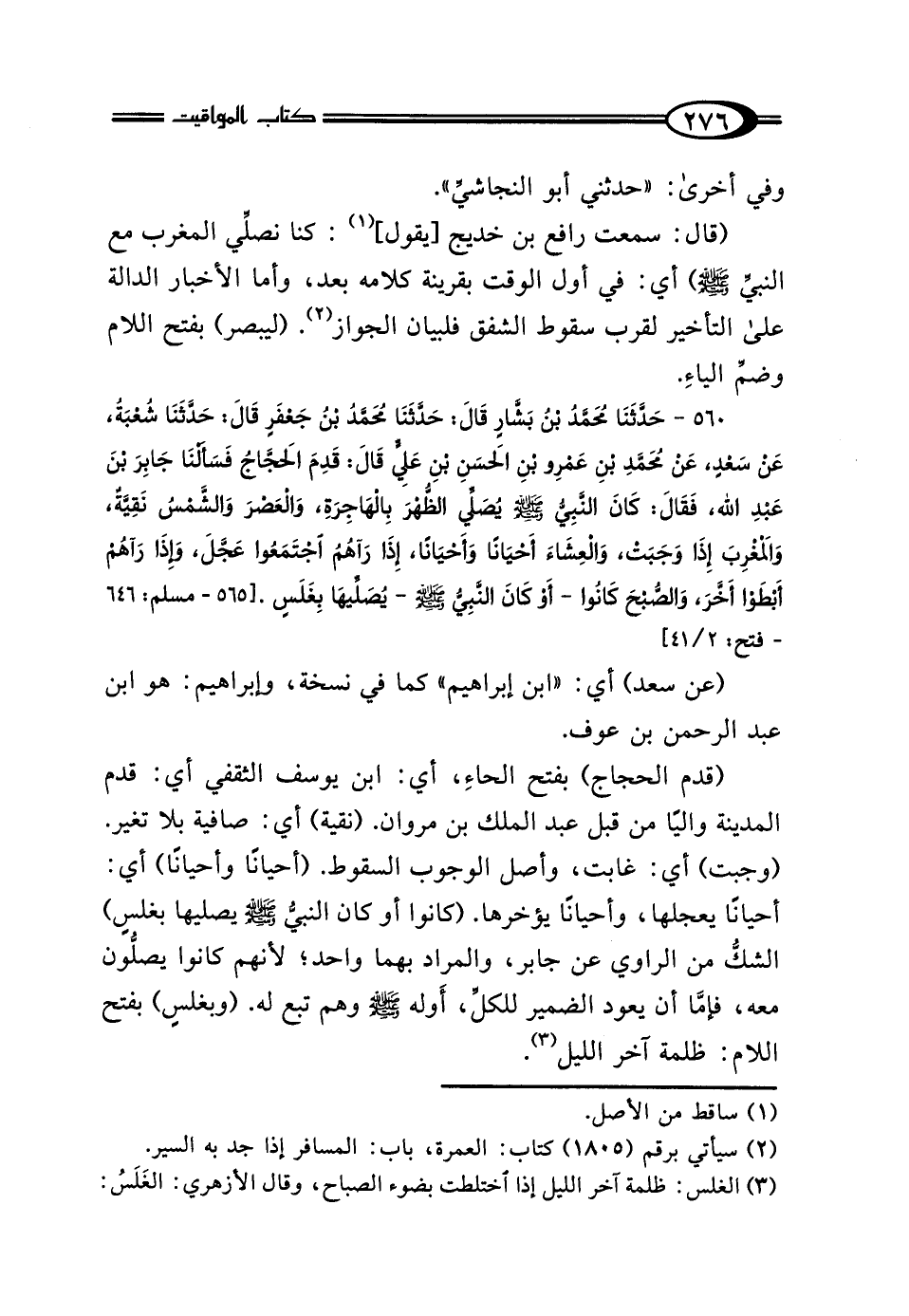 560 - حَدَّثَنَا مُحَمَّدُ بْنُ بَشَّارٍ، قَالَ: حَدَّثَنَا مُحَمَّدُ بْنُ جَعْفَرٍ، قَالَ: حَدَّثَنَا شُعْبَةُ، عَنْ سَعْدِ بْنِ إِبْرَاهِيمَ، عَنْ مُحَمَّدِ بْنِ عَمْرِو بْنِ الحَسَنِ بْنِ عَلِيٍّ، قَالَ: قَدِمَ الحَجَّاجُ فَسَأَلْنَا جَابِرَ بْنَ عَبْدِ اللَّهِ، فَقَالَ: "كَانَ النَّبِيُّ صَلَّى اللهُ عَلَيْهِ وَسَلَّمَ يُصَلِّي الظُّهْرَ بِالهَاجِرَةِ، وَالعَصْرَ وَالشَّمْسُ نَقِيَّةٌ، وَالمَغْرِبَ إِذَا وَجَبَتْ، وَالعِشَاءَ أَحْيَانًا وَأَحْيَانًا، إِذَا رَآهُمُ اجْتَمَعُوا عَجَّلَ، وَإِذَا رَآهُمْ أَبْطَؤُوا أَخَّرَ، وَالصُّبْحَ كَانُوا - أَوْ كَانَ - النَّبِيُّ صَلَّى اللهُ عَلَيْهِ وَسَلَّمَ يُصَلِّيهَا بِغَلَسٍ".