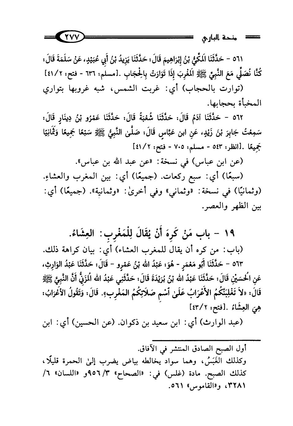 561 - حَدَّثَنَا المَكِّيُّ بْنُ إِبْرَاهِيمَ، قَالَ: حَدَّثَنَا يَزِيدُ بْنُ أَبِي عُبَيْدٍ، عَنْ سَلَمَةَ، قَالَ: "كُنَّا نُصَلِّي مَعَ النَّبِيِّ صَلَّى اللهُ عَلَيْهِ وَسَلَّمَ المَغْرِبَ إِذَا تَوَارَتْ بِالحِجَابِ".