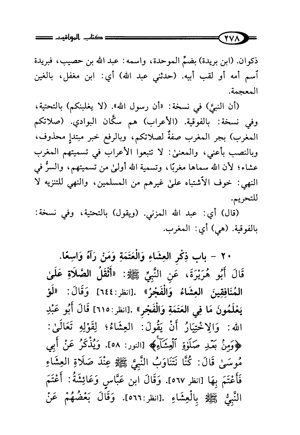 (أن النبي) في نسخة: "أن رسول الله". (لا يغلبنكم) بالتحتية، وفي نسخة: بالفوقية. (الأعراب) هم سكَّان البوادي. (صلاتكم المغرب) بجر المغرب صفةٌ لصلاتكم، وبالرفع خبر مبتدإٍ محذوف، وبالنصب بأعني، والمعنى: لا تتبعوا الأعراب في تسميتهم المغرب عشاء؛ لأن الله سماها مغربًا، وتسمية الله أولى من تسميتهم، والسرُّ في النهي: خوف الاشتباه على غيرهم من المسلمين، والنهي للتنزيه لا للتحريم.