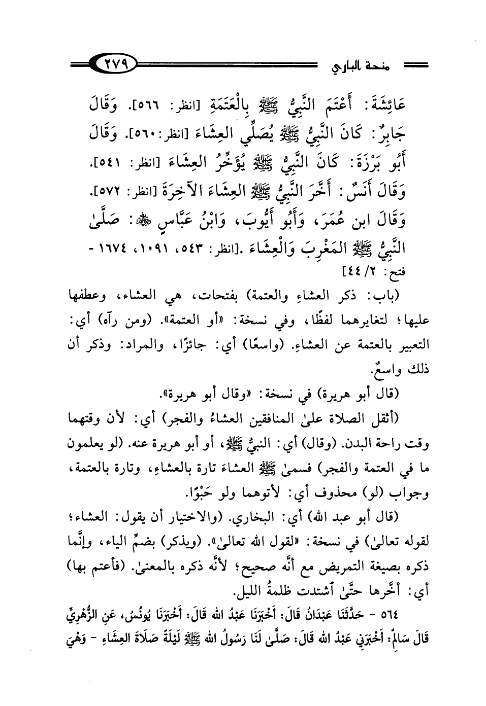 عَائِشَةَ: "أَعْتَمَ النَّبِيُّ صَلَّى اللهُ عَلَيْهِ وَسَلَّمَ بِالعَتَمَةِ" وَقَالَ جَابِرٌ: "كَانَ النَّبِيُّ صَلَّى اللهُ عَلَيْهِ وَسَلَّمَ يُصَلِّي العِشَاءَ" وَقَالَ أَبُو بَرْزَةَ: "كَانَ النَّبِيُّ صَلَّى اللهُ عَلَيْهِ وَسَلَّمَ يُؤَخِّرُ العِشَاءَ" وَقَالَ أَنَسٌ: "أَخَّرَ النَّبِيُّ صَلَّى اللهُ عَلَيْهِ وَسَلَّمَ العِشَاءَ الآخِرَةَ" وَقَالَ ابْنُ عُمَرَ، وَأَبُو أَيُّوبَ، وَابْنُ عَبَّاسٍ رَضِيَ اللَّهُ عَنْهُمْ: "صَلَّى النَّبِيُّ صَلَّى اللهُ عَلَيْهِ وَسَلَّمَ المَغْرِبَ وَالعِشَاءَ".