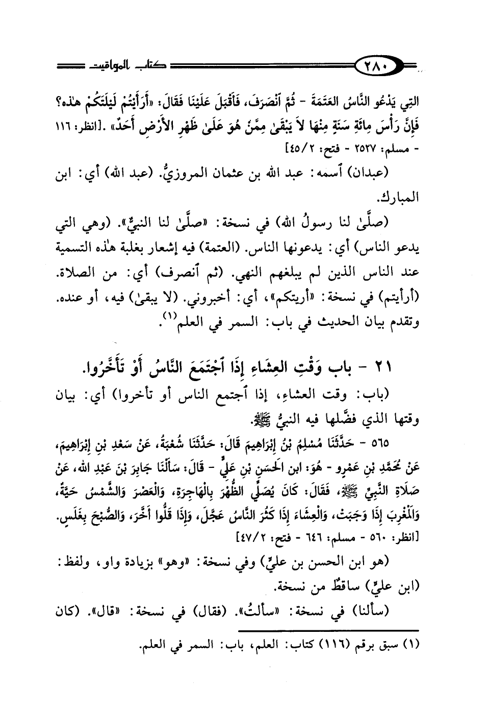 الَّتِي يَدْعُو النَّاسُ العَتَمَةَ، ثُمَّ انْصَرَفَ فَأَقْبَلَ عَلَيْنَا، فَقَالَ: "أَرَأَيْتُمْ لَيْلَتَكُمْ هَذِهِ، فَإِنَّ رَأْسَ مِائَةِ سَنَةٍ مِنْهَا، لَا يَبْقَى مِمَّنْ هُوَ عَلَى ظَهْرِ الأَرْضِ أَحَدٌ".