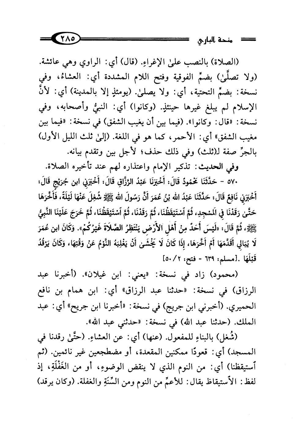 570 - حَدَّثَنَا مَحْمُودٌ يَعْنِي ابْنَ غَيْلانَ، قَالَ: أَخْبَرَنَا عَبْدُ الرَّزَّاقِ، قَالَ: أَخْبَرَنِي ابْنُ جُرَيْجٍ، قَالَ: أَخْبَرَنِي نَافِعٌ، قَالَ: حَدَّثَنَا عَبْدُ اللَّهِ بْنُ عُمَرَ: أَنَّ رَسُولَ اللَّهِ صَلَّى اللهُ عَلَيْهِ وَسَلَّمَ شُغِلَ عَنْهَا لَيْلَةً، فَأَخَّرَهَا حَتَّى رَقَدْنَا فِي المَسْجِدِ، ثُمَّ اسْتَيْقَظْنَا، ثُمَّ رَقَدْنَا، ثُمَّ اسْتَيْقَظْنَا، ثُمَّ خَرَجَ عَلَيْنَا النَّبِيُّ صَلَّى اللهُ عَلَيْهِ وَسَلَّمَ، ثُمَّ قَالَ: "لَيْسَ أَحَدٌ مِنْ أَهْلِ الأَرْضِ يَنْتَظِرُ الصَّلاةَ غَيْرُكُمْ" وَكَانَ ابْنُ عُمَرَ: "لَا يُبَالِي أَقَدَّمَهَا أَمْ أَخَّرَهَا، إِذَا كَانَ لَا يَخْشَى أَنْ يَغْلِبَهُ النَّوْمُ عَنْ وَقْتِهَا، وَكَانَ يَرْقُدُ قَبْلَهَا".