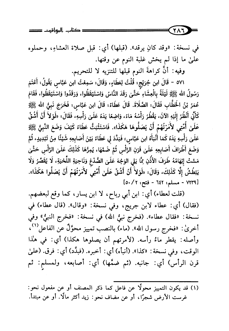 571 - وَقَالَ: سَمِعْتُ ابْنَ عَبَّاسٍ، يَقُولُ: أَعْتَمَ رَسُولُ اللَّهِ صَلَّى اللهُ عَلَيْهِ وَسَلَّمَ لَيْلَةً بِالعِشَاءِ، حَتَّى رَقَدَ النَّاسُ وَاسْتَيْقَظُوا، وَرَقَدُوا وَاسْتَيْقَظُوا، فَقَامَ عُمَرُ بْنُ الخَطَّابِ فَقَالَ: الصَّلاةَ - قَالَ عَطَاءٌ: قَالَ ابْنُ عَبَّاسٍ -: فَخَرَجَ نَبِيُّ اللَّهِ صَلَّى اللهُ عَلَيْهِ وَسَلَّمَ، كَأَنِّي أَنْظُرُ إِلَيْهِ الآنَ، يَقْطُرُ رَأْسُهُ مَاءً، وَاضِعًا يَدَهُ عَلَى رَأْسِهِ، فَقَالَ: "لَوْلَا أَنْ أَشُقَّ عَلَى أُمَّتِي، لَأَمَرْتُهُمْ أَنْ يُصَلُّوهَا هَكَذَا" فَاسْتَثْبَتُّ عَطَاءً كَيْفَ وَضَعَ النَّبِيُّ صَلَّى اللهُ عَلَيْهِ وَسَلَّمَ عَلَى رَأْسِهِ يَدَهُ، كَمَا أَنْبَأَهُ ابْنُ عَبَّاسٍ فَبَدَّدَ لِي عَطَاءٌ بَيْنَ أَصَابِعِهِ شَيْئًا مِنْ تَبْدِيدٍ، ثُمَّ وَضَعَ أَطْرَافَ أَصَابِعِهِ عَلَى قَرْنِ الرَّأْسِ، ثُمَّ ضَمَّهَا يُمِرُّهَا كَذَلِكَ عَلَى الرَّأْسِ، حَتَّى مَسَّتْ إِبْهَامُهُ طَرَفَ الأُذُنِ، مِمَّا يَلِي الوَجْهَ عَلَى الصُّدْغِ، وَنَاحِيَةِ اللِّحْيَةِ، لَا يُقَصِّرُ وَلَا يَبْطُشُ إلا كَذَلِكَ، وَقَالَ: "لَوْلَا أَنْ أَشُقَّ عَلَى أُمَّتِي لَأَمَرْتُهُمْ أَنْ يُصَلُّوا هَكَذَا".