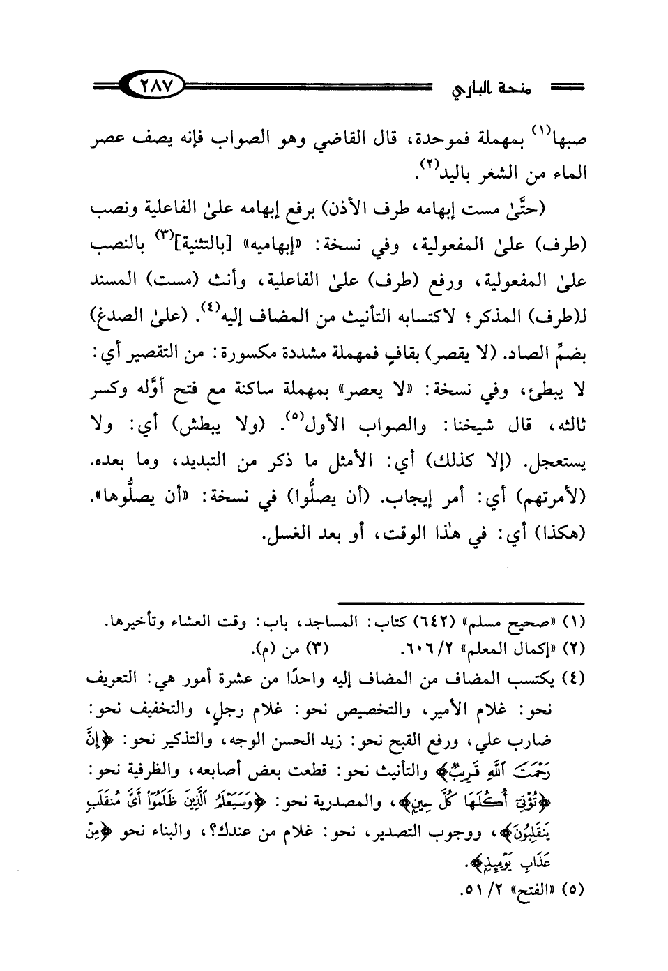 (¬4) يكتسب المضاف من المضاف إليه واحدًا من عشرة أمور هي: التعريف نحو: غلام الأمير، والتخصيص نحو: غلام رجلٍ، والتخفيف نحو: ضارب علي، ورفع القبح نحو: زيد الحسن الوجه، والتذكير نحو: {إنَّ رَحْمَتَ اللَّهِ قَرِيبٌ} والتأنيث نحو: قطعت بعض أصابعه، والظرفية نحو: {تُؤْتِي أُكُلَهَا كُلَّ حِينٍ}، والمصدرية نحو: {وَسَيَعْلَمُ الَّذِينَ ظَلَمُوا أَيَّ مُنْقَلَبٍ يَنْقَلِبُونَ}، ووجوب التصدير، نحو: غلام من عندك؟، والبناء نحو {مِنْ عَذَابِ يَوْمِئِذٍ}.