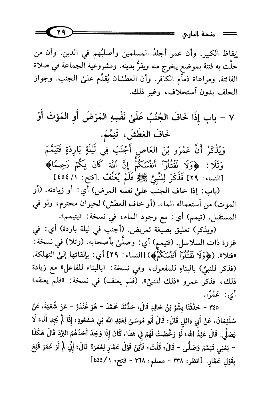 وَيُذْكَرُ أَنَّ عَمْرَو بْنَ العَاصِ: "أَجْنَبَ فِي لَيْلَةٍ بَارِدَةٍ، فَتَيَمَّمَ وَتَلا: {وَلَا تَقْتُلُوا أَنْفُسَكُمْ إِنَّ اللَّهَ كَانَ بِكُمْ رَحِيمًا} [النساء: 29] فَذَكَرَ لِلنَّبِيِّ صَلَّى اللهُ عَلَيْهِ وَسَلَّمَ فَلَمْ يُعَنِّفْ".