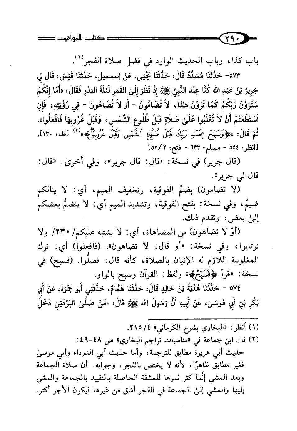 573 - حَدَّثَنَا مُسَدَّدٌ، قَالَ: حَدَّثَنَا يَحْيَى، عَنْ إِسْمَاعِيلَ، حَدَّثَنَا قَيْسٌ، قَالَ لِي جَرِيرُ بْنُ عَبْدِ اللَّهِ: كُنَّا عِنْدَ النَّبِيِّ صَلَّى اللهُ عَلَيْهِ وَسَلَّمَ إِذْ نَظَرَ إِلَى القَمَرِ لَيْلَةَ البَدْرِ، فَقَالَ: "أَمَا إِنَّكُمْ سَتَرَوْنَ رَبَّكُمْ كَمَا تَرَوْنَ هَذَا، لَا تُضَامُّونَ - أَوْ لَا تُضَاهُونَ - فِي رُؤْيَتِهِ فَإِنِ اسْتَطَعْتُمْ أَنْ لَا تُغْلَبُوا عَلَى صَلاةٍ قَبْلَ طُلُوعِ الشَّمْسِ وَقَبْلَ غُرُوبِهَا، فَافْعَلُوا" ثُمَّ قَالَ: "وَسَبِّحْ بِحَمْدِ رَبِّكَ قَبْلَ طُلُوعِ الشَّمْسِ وَقَبْلَ غُرُوبِهَا" [طه: 130] (¬2) [انظر: 554 - مسلم: 633 - فتح: 2/ 52]