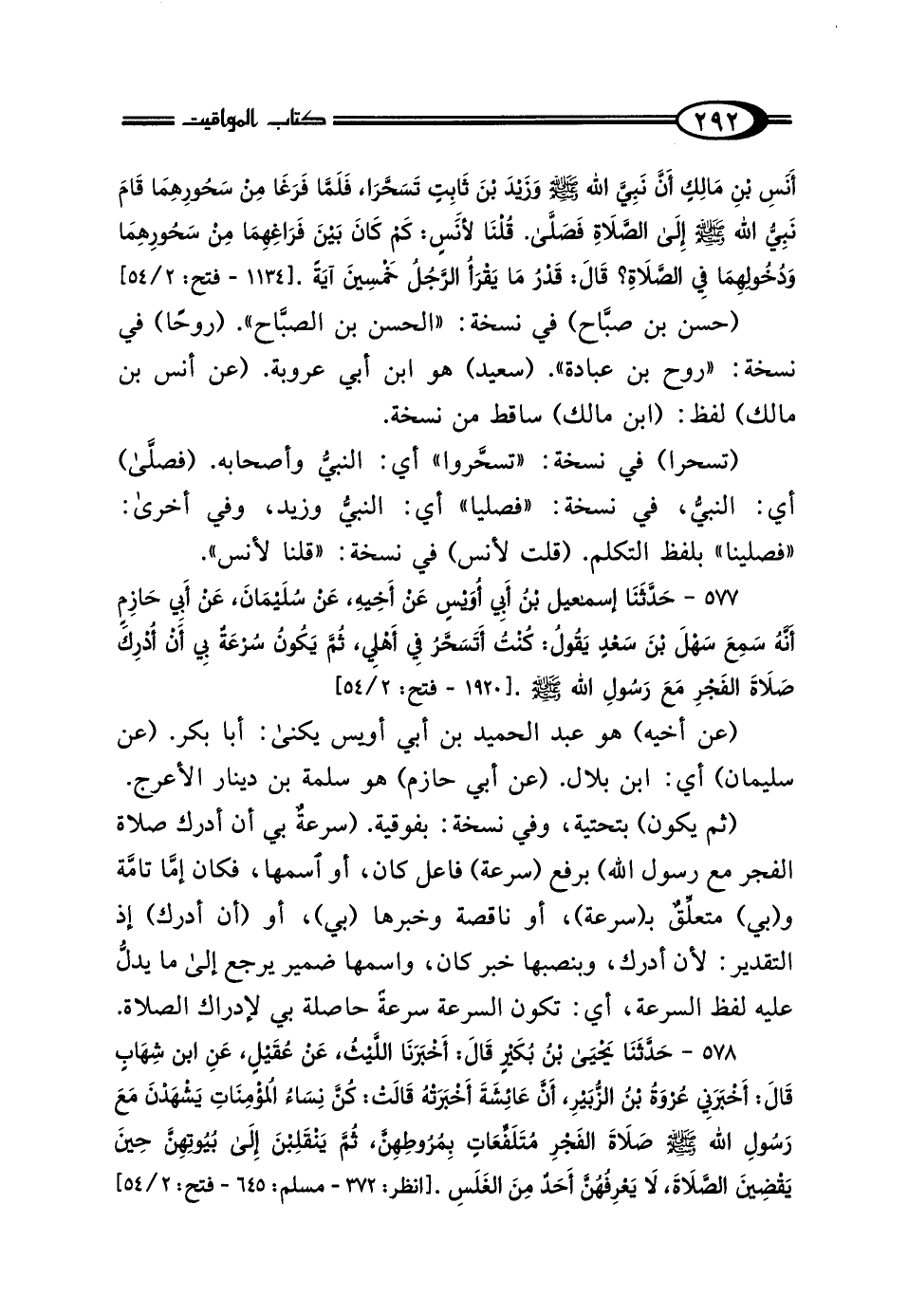 أَنَسِ بْنِ مَالِكٍ: أَنَّ نَبِيَّ اللَّهِ صَلَّى اللهُ عَلَيْهِ وَسَلَّمَ وَزَيْدَ بْنَ ثَابِتٍ: "تَسَحَّرَا فَلَمَّا فَرَغَا مِنْ سَحُورِهِمَا، قَامَ نَبِيُّ اللَّهِ صَلَّى اللهُ عَلَيْهِ وَسَلَّمَ إِلَى الصَّلاةِ، فَصَلَّى"، قُلْنَا لِأَنَسٍ: كَمْ كَانَ بَيْنَ فَرَاغِهِمَا مِنْ سَحُورِهِمَا وَدُخُولِهِمَا فِي الصَّلاةِ؟ قَالَ: "قَدْرُ مَا يَقْرَأُ الرَّجُلُ خَمْسِينَ آيَةً".