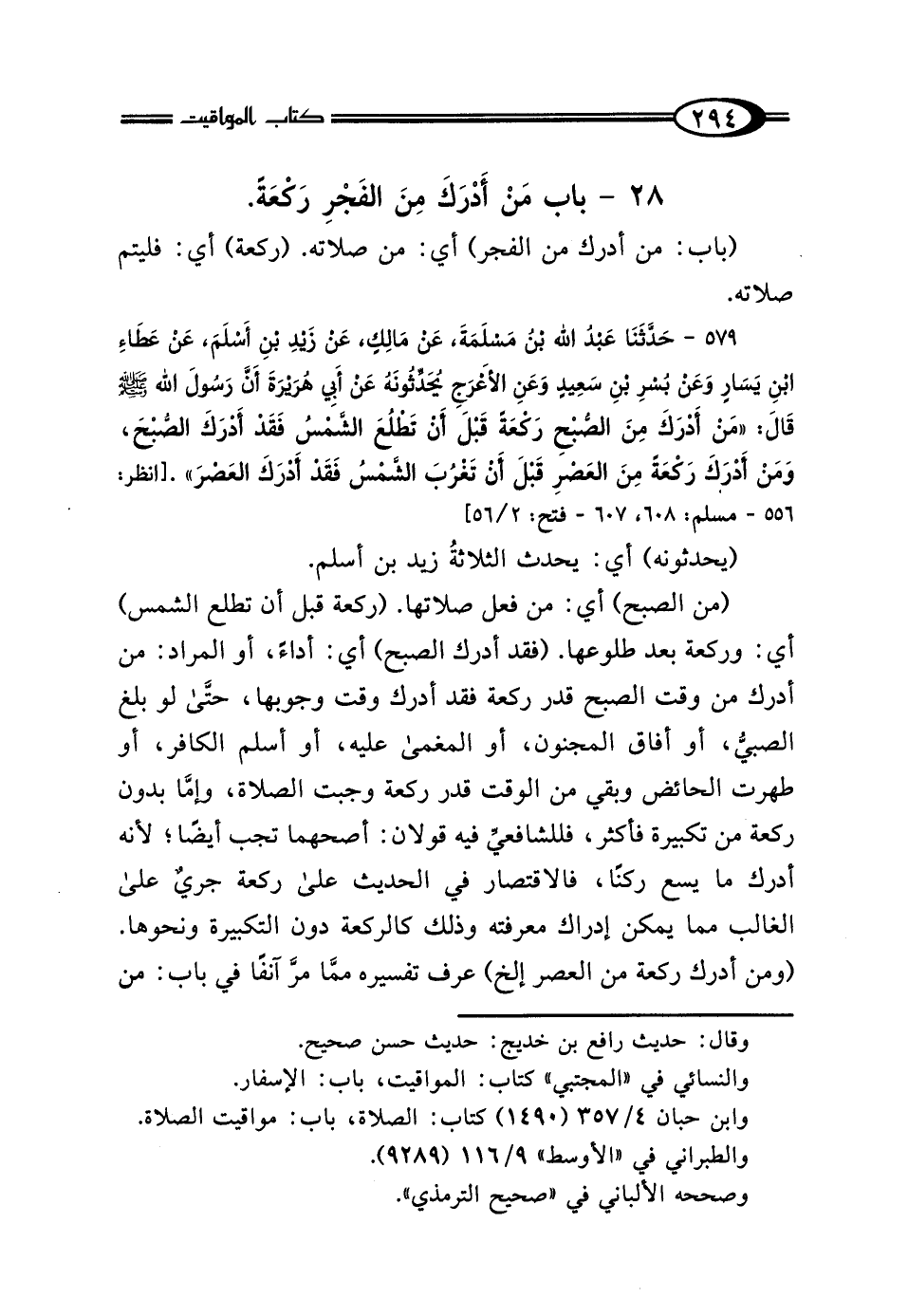 579 - حَدَّثَنَا عَبْدُ اللَّهِ بْنُ مَسْلَمَةَ، عَنْ مَالِكٍ، عَنْ زَيْدِ بْنِ أَسْلَمَ، عَنْ عَطَاءِ بْنِ يَسَارٍ، وَعَنْ بُسْرِ بْنِ سَعِيدٍ، وَعَنِ الأَعْرَجِ يُحَدِّثُونَهُ، عَنْ أَبِي هُرَيْرَةَ: أَنَّ رَسُولَ اللَّهِ صَلَّى اللهُ عَلَيْهِ وَسَلَّمَ قَالَ: "مَنْ أَدْرَكَ مِنَ الصُّبْحِ رَكْعَةً قَبْلَ أَنْ تَطْلُعَ الشَّمْسُ، فَقَدْ أَدْرَكَ الصُّبْحَ، وَمَنْ أَدْرَكَ رَكْعَةً مِنَ العَصْرِ قَبْلَ أَنْ تَغْرُبَ الشَّمْسُ، فَقَدْ أَدْرَكَ العَصْرَ".
