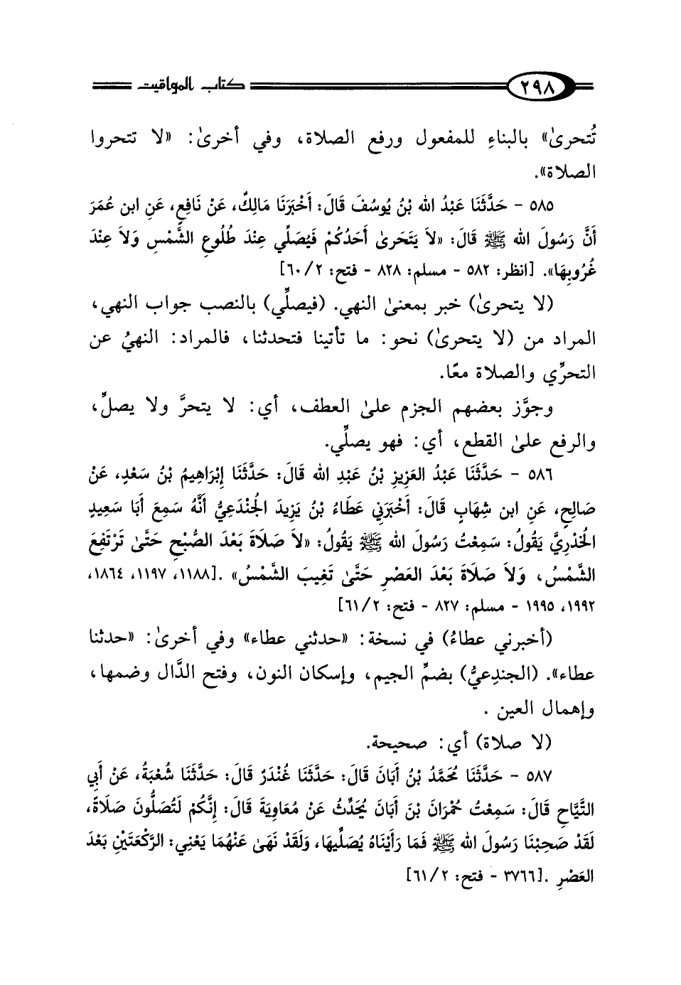 586 - حَدَّثَنَا عَبْدُ العَزِيزِ بْنُ عَبْدِ اللَّهِ، قَالَ: حَدَّثَنَا إِبْرَاهِيمُ بْنُ سَعْدٍ، عَنْ صَالِحٍ، عَنِ ابْنِ شِهَابٍ، قَالَ: أَخْبَرَنِي عَطَاءُ بْنُ يَزِيدَ الجُنْدَعِيُّ، أَنَّهُ سَمِعَ أَبَا سَعِيدٍ الخُدْرِيَّ، يَقُولُ: سَمِعْتُ رَسُولَ اللَّهِ صَلَّى اللهُ عَلَيْهِ وَسَلَّمَ يَقُولُ: "لَا صَلاةَ بَعْدَ الصُّبْحِ حَتَّى تَرْتَفِعَ الشَّمْسُ، وَلَا صَلاةَ بَعْدَ العَصْرِ حَتَّى تَغِيبَ الشَّمْسُ".
