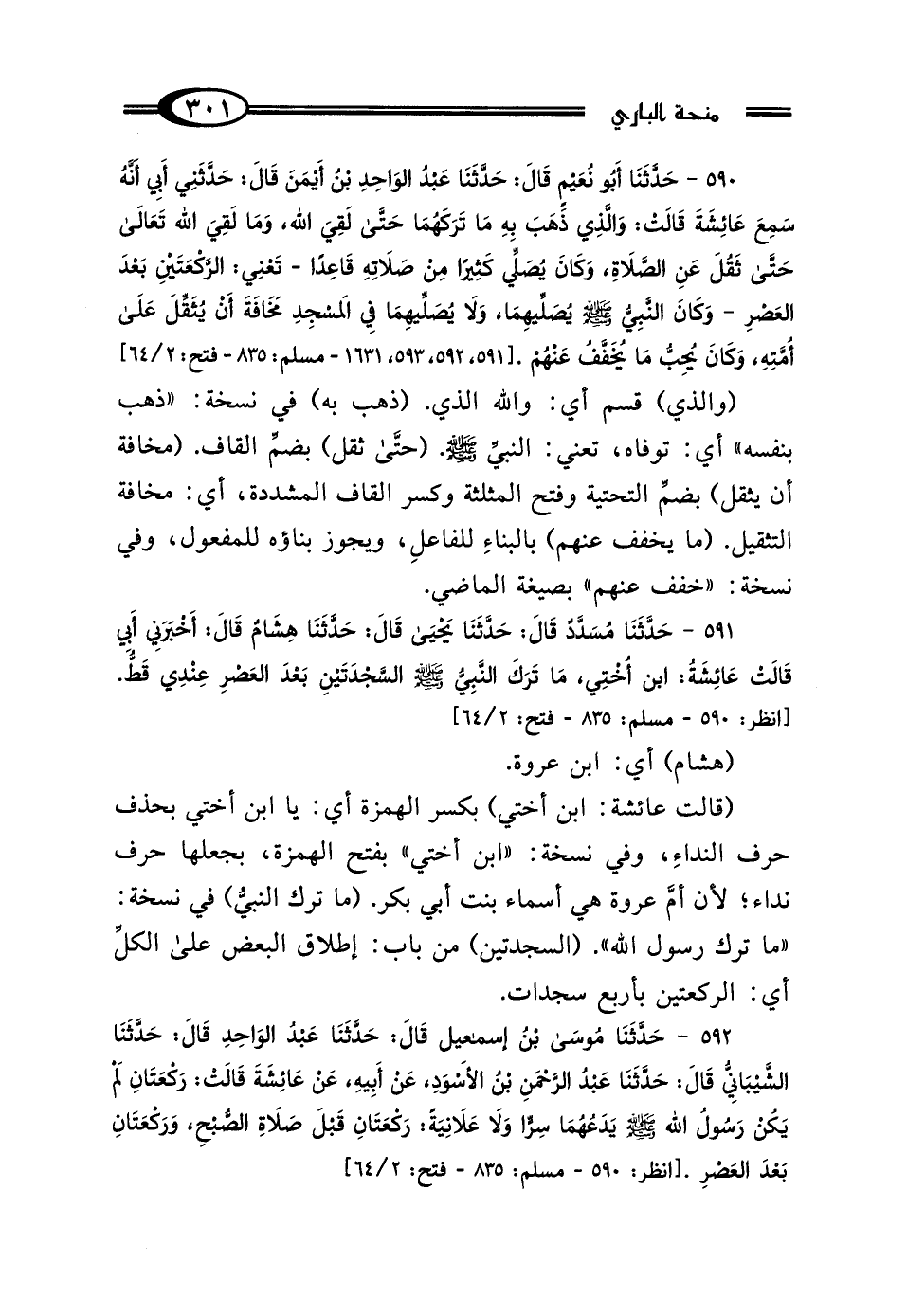 591 - حَدَّثَنَا مُسَدَّدٌ، قَالَ: حَدَّثَنَا يَحْيَى، قَالَ: حَدَّثَنَا هِشَامٌ، قَالَ: أَخْبَرَنِي أَبِي، قَالَتْ عَائِشَةُ: ابْنَ أُخْتِي "مَا تَرَكَ النَّبِيُّ صَلَّى اللهُ عَلَيْهِ وَسَلَّمَ السَّجْدَتَيْنِ بَعْدَ العَصْرِ عِنْدِي قَطُّ".
