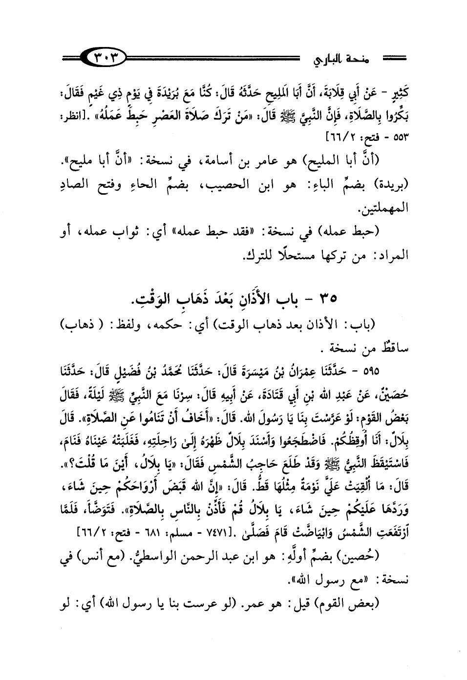 595 - حَدَّثَنَا عِمْرَانُ بْنُ مَيْسَرَةَ، قَالَ: حَدَّثَنَا مُحَمَّدُ بْنُ فُضَيْلٍ، قَالَ: حَدَّثَنَا حُصَيْنٌ، عَنْ عَبْدِ اللَّهِ بْنِ أَبِي قَتَادَةَ، عَنْ أَبِيهِ، قَالَ: سِرْنَا مَعَ النَّبِيِّ صَلَّى اللهُ عَلَيْهِ وَسَلَّمَ لَيْلَةً، فَقَالَ: بَعْضُ القَوْمِ: لَوْ عَرَّسْتَ بِنَا يَا رَسُولَ اللَّهِ، قَالَ: "أَخَافُ أَنْ تَنَامُوا عَنِ الصَّلاةِ" قَالَ بِلالٌ: أَنَا أُوقِظُكُمْ، فَاضْطَجَعُوا، وَأَسْنَدَ بِلالٌ ظَهْرَهُ إِلَى رَاحِلَتِهِ، فَغَلَبَتْهُ عَيْنَاهُ فَنَامَ، فَاسْتَيْقَظَ النَّبِيُّ صَلَّى اللهُ عَلَيْهِ وَسَلَّمَ، وَقَدْ طَلَعَ حَاجِبُ الشَّمْسِ، فَقَالَ: "يَا بِلالُ، أَيْنَ مَا قُلْتَ؟ " قَالَ: مَا أُلْقِيَتْ عَلَيَّ نَوْمَةٌ مِثْلُهَا قَطُّ، قَالَ: "إِنَّ اللَّهَ قَبَضَ أَرْوَاحَكُمْ حِينَ شَاءَ، وَرَدَّهَا عَلَيْكُمْ حِينَ شَاءَ، يَا بِلالُ، قُمْ فَأَذِّنْ بِالنَّاسِ بِالصَّلاةِ" فَتَوَضَّأَ، فَلَمَّا ارْتَفَعَتِ الشَّمْسُ وَابْيَاضَّتْ، قَامَ فَصَلَّى.
