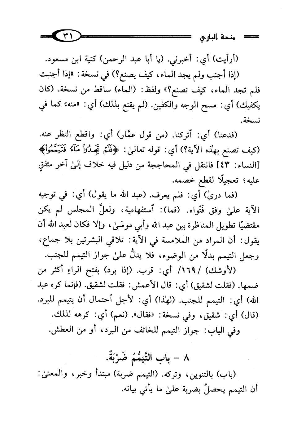 (باب) بالتنوين، وتركه. (التيمم ضربة) مبتدأ وخبر، والمعنى: أن التيمم يحصلُ بضربة على ما يأتي بيانه.
