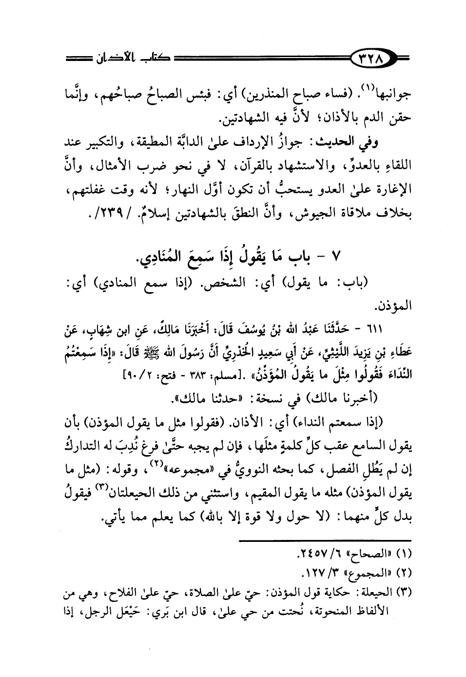 611 - حَدَّثَنَا عَبْدُ اللَّهِ بْنُ يُوسُفَ، قَالَ: أَخْبَرَنَا مَالِكٌ، عَنِ ابْنِ شِهَابٍ، عَنْ عَطَاءِ بْنِ يَزِيدَ اللَّيْثِيِّ، عَنْ أَبِي سَعِيدٍ الخُدْرِيِّ: أَنَّ رَسُولَ اللَّهِ صَلَّى اللهُ عَلَيْهِ وَسَلَّمَ قَالَ: "إِذَا سَمِعْتُمُ النِّدَاءَ، فَقُولُوا مِثْلَ مَا يَقُولُ المُؤَذِّنُ".