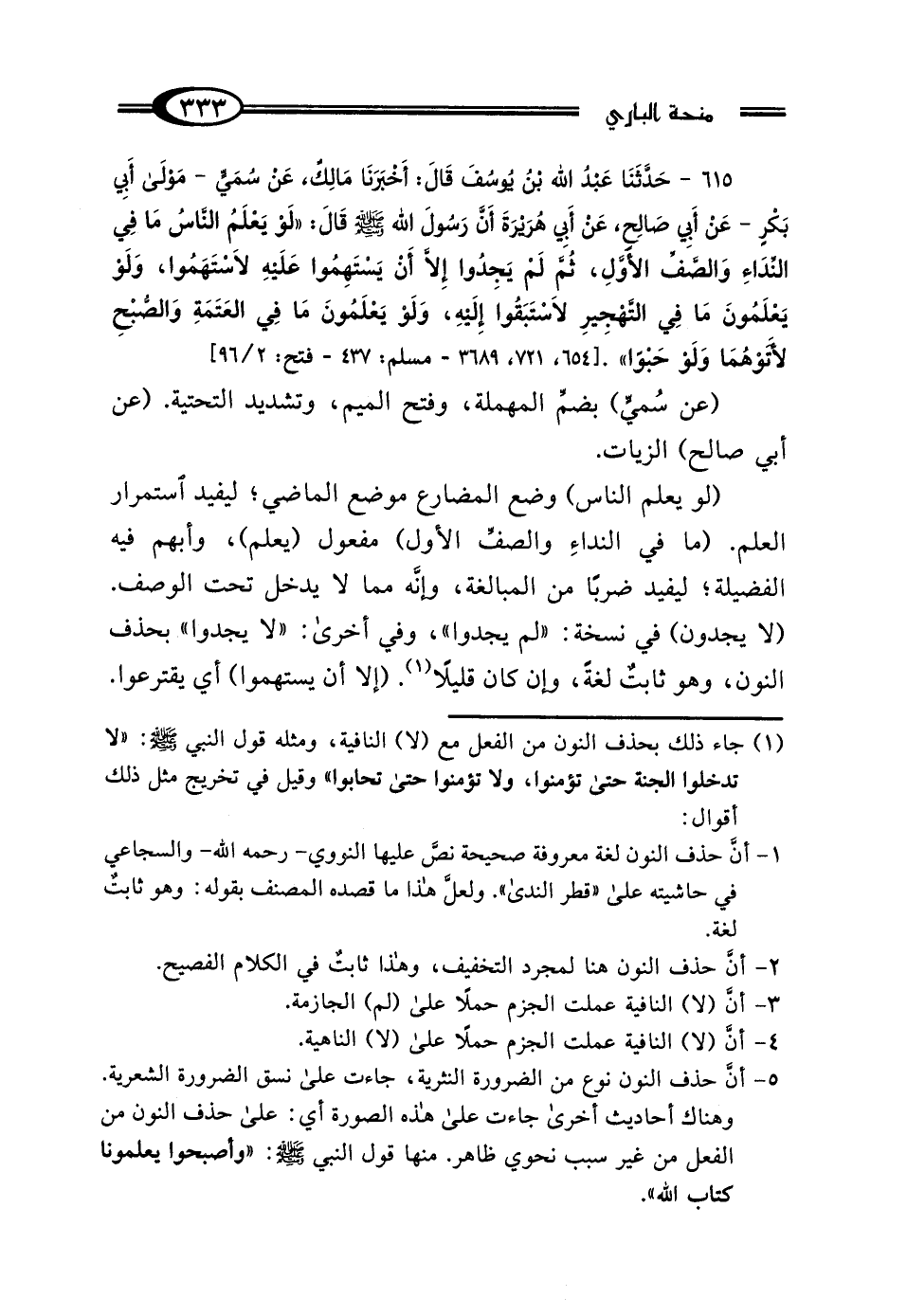 615 - حَدَّثَنَا عَبْدُ اللَّهِ بْنُ يُوسُفَ، قَالَ: أَخْبَرَنَا مَالِكٌ، عَنْ سُمَيٍّ مَوْلَى أَبِي بَكْرٍ، عَنْ أَبِي صَالِحٍ، عَنْ أَبِي هُرَيْرَةَ: أَنَّ رَسُولَ اللَّهِ صَلَّى اللهُ عَلَيْهِ وَسَلَّمَ قَالَ: "لَوْ يَعْلَمُ النَّاسُ مَا فِي النِّدَاءِ وَالصَّفِّ الأَوَّلِ، ثُمَّ لَمْ يَجِدُوا إلا أَنْ يَسْتَهِمُوا عَلَيْهِ لاسْتَهَمُوا، وَلَوْ يَعْلَمُونَ مَا فِي التَّهْجِيرِ لاسْتَبَقُوا إِلَيْهِ، وَلَوْ يَعْلَمُونَ مَا فِي العَتَمَةِ وَالصُّبْحِ، لَأَتَوْهُمَا وَلَوْ حَبْوًا".