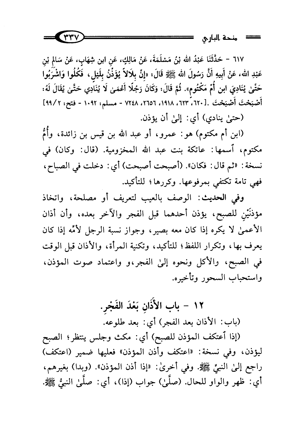 617 - حَدَّثَنَا عَبْدُ اللَّهِ بْنُ مَسْلَمَةَ، عَنْ مَالِكٍ، عَنِ ابْنِ شِهَابٍ، عَنْ سَالِمِ بْنِ عَبْدِ اللَّهِ، عَنْ أَبِيهِ، أَنَّ رَسُولَ اللَّهِ صَلَّى اللهُ عَلَيْهِ وَسَلَّمَ قَالَ: «إِنَّ بِلاَلًا يُؤَذِّنُ بِلَيْلٍ، فَكُلُوا وَاشْرَبُوا حَتَّى يُنَادِيَ ابْنُ أُمِّ مَكْتُومٍ»، ثُمَّ قَالَ: وَكَانَ رَجُلًا أَعْمَى، لاَ يُنَادِي حَتَّى يُقَالَ لَهُ: أَصْبَحْتَ أَصْبَحْتَ.