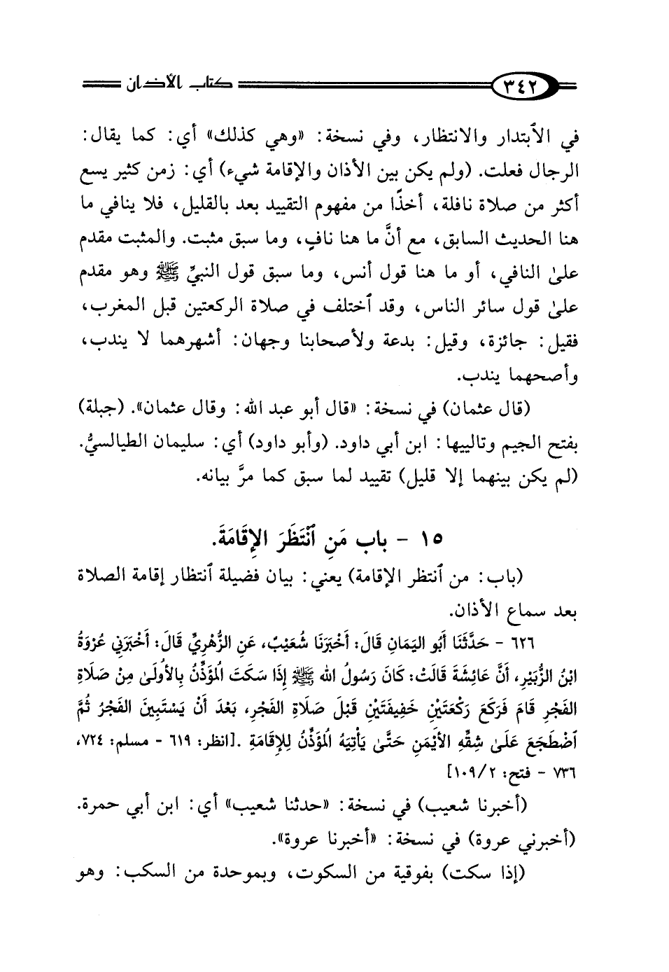 في الابتدار والانتظار، وفي نسخة: "وهي كذلك" أي: كما يقال: الرجال فعلت. (ولم يكن بين الأذان والإقامة شيء) أي: زمن كثير يسع أكثر من صلاة نافلة، أخذًا من مفهوم التقييد بعد بالقليل، فلا ينافي ما هنا الحديث السابق، مع أنّ ما هنا نافٍ، وما سبق مثبت. والمثبت مقدم على النافي، أو ما هنا قول أنس، وما سبق قول النبي - صلى الله عليه وسلم - وهو مقدم على قول سائر الناس، وقد اختلف في صلاة الركعتين قبل المغرب، فقيل: جائزة، وقيل: بدعة ولأصحابنا وجهان: أشهرهما لا يندب، وأصحهما يندب.