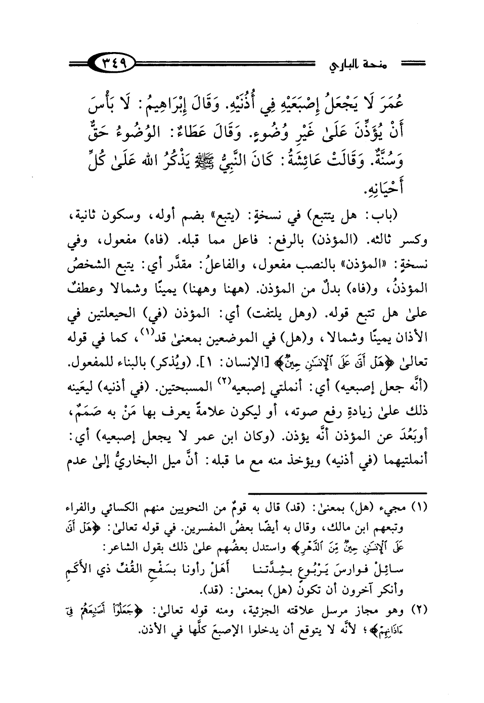(باب: هل يتتبع) في نسخةٍ: "يتبع" بضم أوله، وسكون ثانية، وكسر ثالثه. (المؤذن) بالرفع: فاعل مما قبله. (فاه) مفعول، وفي نسخةٍ: "المؤذن" بالنصب مفعول، والفاعلُ: مقدَّر أي: يتبع الشخصُ المؤذنُ، و (فاه) بدلٌ من المؤذن. (ها هنا وههنا) يمينًا وشمالا وعطفٌ على هل تتبع قوله. (وهل يلتفت) أي: المؤذن (في) الحيعلتين في الأذان يمينًا وشمالا، و (هل) في الموضعين بمعنى قد (¬1)، كما في قوله تعالى {هَلْ أَتَى عَلَى الْإِنْسَانِ حِينٌ} [الإنسان: 1]. (ويُذكر) بالبناء للمفعول. (أنَّه جعل إصبعيه) أي: أنملتي إصبعيه (¬2) المسبحتين. (في أذنيه) ليعَينه ذلك على زيادةِ رفع صوته، أو ليكون علامةً يعرف بها مَنْ به صَمَمٌ، أو بَعُدَ عن المؤذن أنَّه يؤذن. (وكان ابن عمر لا يجعل إصبعيه) أي: أنملتيهما (في أذنيه) ويؤخذ منه مع ما قبله: أنَّ ميل البخاريُّ إلى عدم