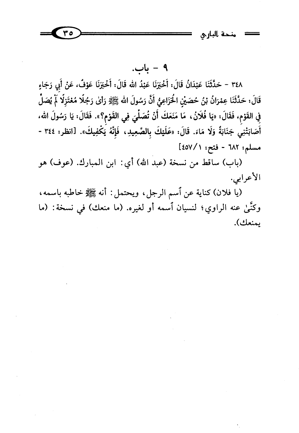 348 - حَدَّثَنَا عَبْدَانُ، قَالَ: أَخْبَرَنَا عَبْدُ اللَّهِ، قَالَ: أَخْبَرَنَا عَوْفٌ، عَنْ أَبِي رَجَاءٍ، قَالَ: حَدَّثَنَا عِمْرَانُ بْنُ حُصَيْنٍ الخُزَاعِيُّ، أَنَّ رَسُولَ اللَّهِ صَلَّى اللهُ عَلَيْهِ وَسَلَّمَ رَأَى رَجُلًا مُعْتَزِلًا لَمْ يُصَلِّ فِي القَوْمِ، فَقَالَ: "يَا فُلانُ مَا مَنَعَكَ أَنْ تُصَلِّيَ فِي القَوْمِ؟ " فَقَالَ يَا رَسُولَ اللَّهِ: أَصَابَتْنِي جَنَابَةٌ وَلَا مَاءَ، قَالَ: "عَلَيْكَ بِالصَّعِيدِ فَإِنَّهُ يَكْفِيكَ".