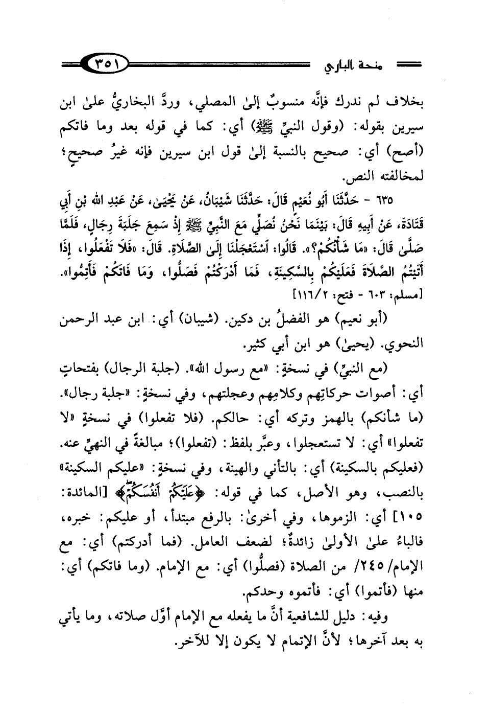 (مع النبي) في نسخةٍ: "مع رسول الله". (جلبة الرجال) بفتحاتٍ أي: أصوات حركاتِهم وكلامِهم وعجلتهم، وفي نسخةٍ: "جلبة رجال". (ما شأنكم) بالهمز وتركه أي: حالكم. (فلا تفعلوا) في نسخةٍ "لا تفعلوا" أي: لا تستعجلوا، وعبَّر بلفظ: (تفعلوا)؛ مبالغةً في النهي عنه. (فعليكم بالسكينة) أي: بالتأني والهينة، وفي نسخةٍ: "عليكم السكينة" بالنصب، وهو الأصل، كما في قوله: {عَلَيْكُمْ أَنْفُسَكُمْ} [المائدة: 105] أي: الزموها، وفي أخرى: بالرفع مبتدأ، أو عليكم: خبره، فالباءُ على الأولى زائدةٌ؛ لضعف العامل. (فما أدركتم) أي: مع الإمام من الصلاة (فصلوا) أي: مع الإمام. (وما فاتكم) أي: منها (فأتموا) أي: فأتموه وحدكم.