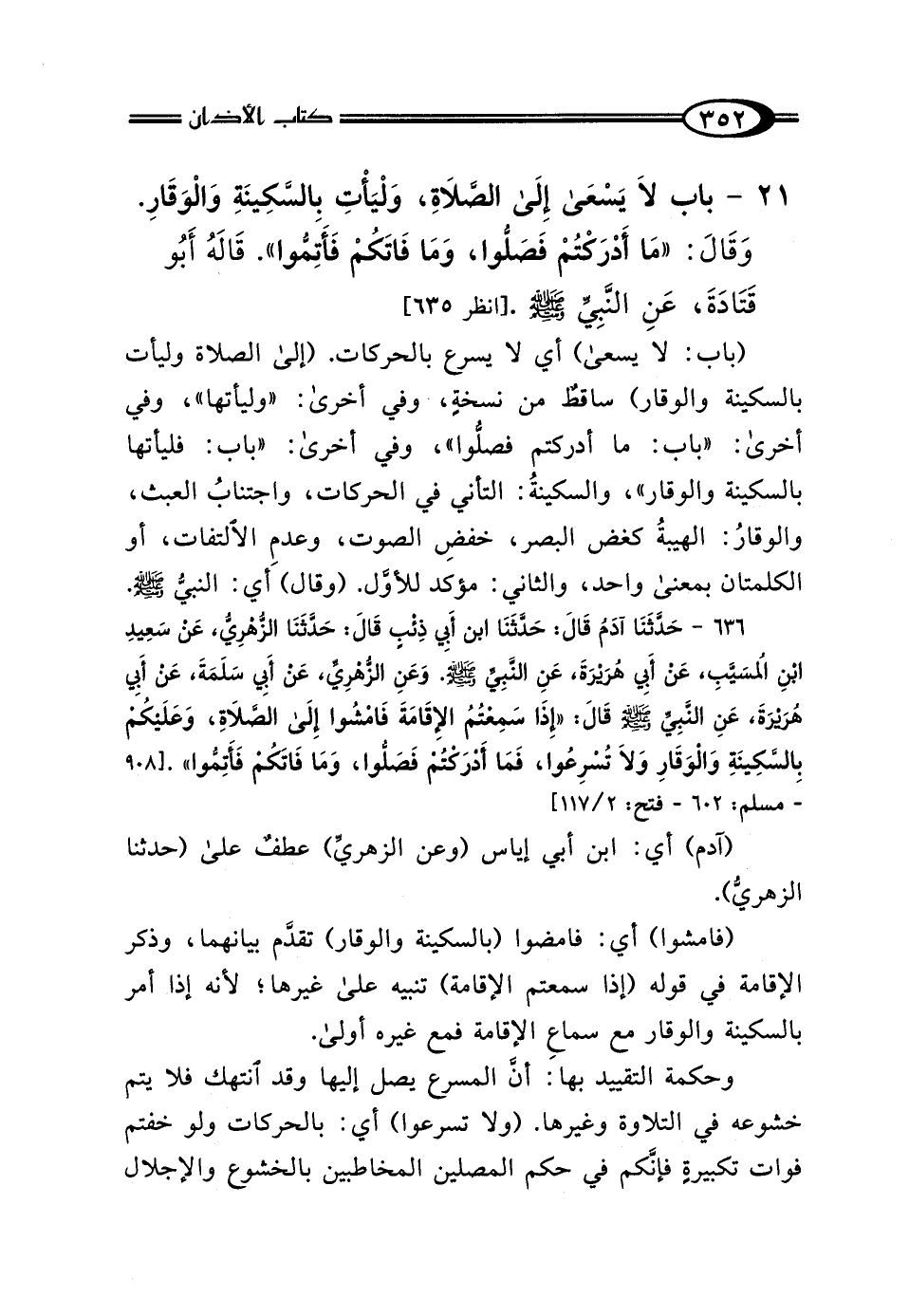 636 - حَدَّثَنَا آدَمُ، قَالَ: حَدَّثَنَا ابْنُ أَبِي ذِئْبٍ، قَالَ: حَدَّثَنَا الزُّهْرِيُّ، عَنْ سَعِيدِ بْنِ المُسَيِّبِ، عَنْ أَبِي هُرَيْرَةَ، عَنِ النَّبِيِّ صَلَّى اللهُ عَلَيْهِ وَسَلَّمَ، وَعَنِ الزُّهْرِيِّ، عَنْ أَبِي سَلَمَةَ، عَنْ أَبِي هُرَيْرَةَ، عَنِ النَّبِيِّ صَلَّى اللهُ عَلَيْهِ وَسَلَّمَ قَالَ: "إِذَا سَمِعْتُمُ الإِقَامَةَ، فَامْشُوا إِلَى الصَّلاةِ وَعَلَيْكُمْ بِالسَّكِينَةِ وَالوَقَارِ، وَلَا تُسْرِعُوا، فَمَا أَدْرَكْتُمْ فَصَلُّوا، وَمَا فَاتَكُمْ فَأَتِمُّوا".