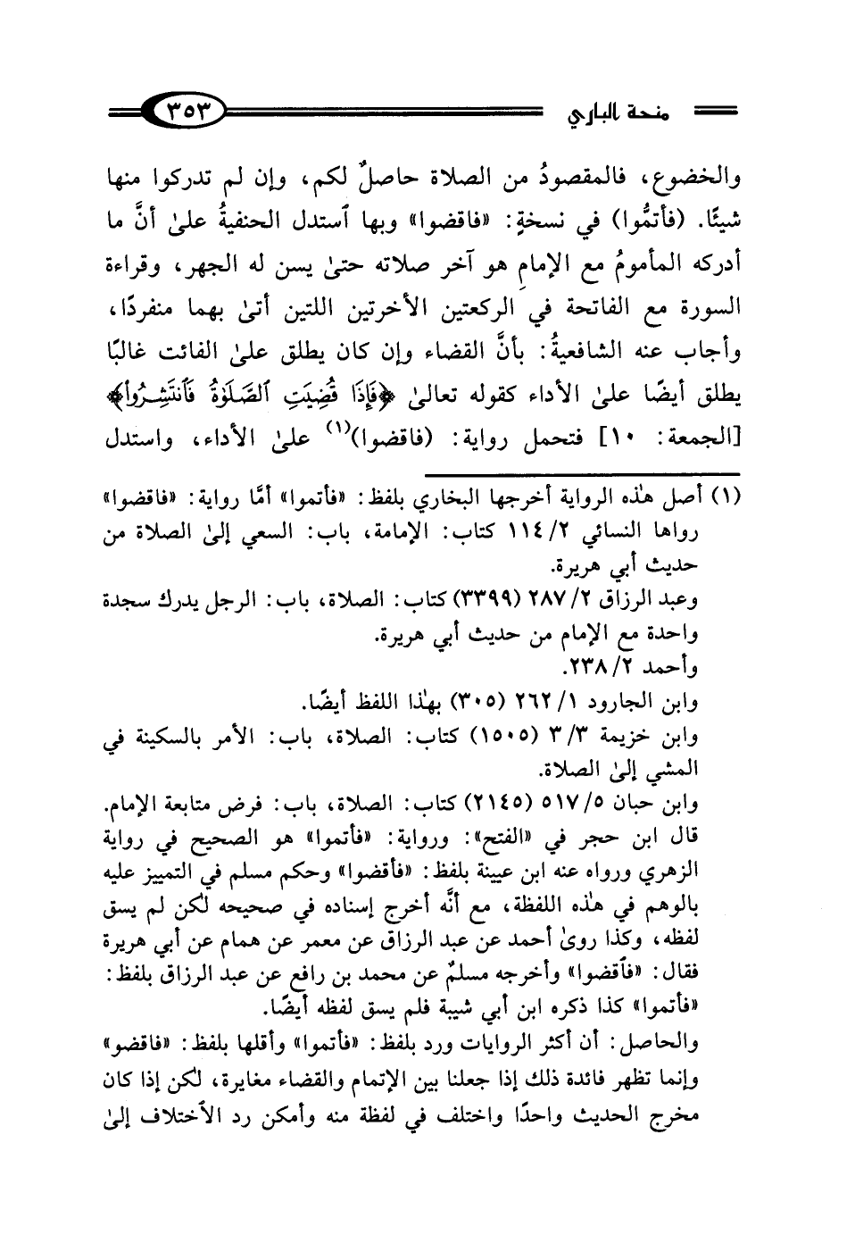 قال ابن حجر في "الفتح": ورواية: "فأتموا" هو الصحيح في رواية الزهري ورواه عنه ابن عيينة بلفظ: "فاقضوا" وحكم مسلم في التمييز عليه بالوهم في هذه اللفظة، مع أنَّه أخرج إسناده في صحيحه لكن لم يسق لفظه، وكذا روى أحمد عن عبد الرزاق عن معمر عن همام عن أبي هريرة فقال: "فاقضوا" وأخرجه مسلمٌ عن محمد بن رافع عن عبد الرزاق بلفظ: "فأتموا" كذا ذكره ابن أبي شيبة فلم يسق لفظه أيضًا.