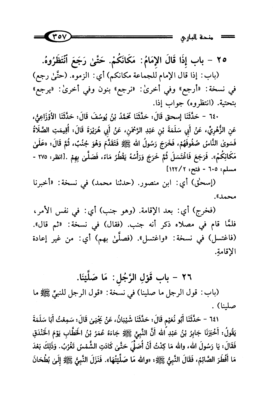 (باب: إذا قال الإمام للجماعة مكانكم) أي: الزموه. (حتَّى رجع) في نسخة: "أرجع" وفي أخرى: "نرجع" بنون وفي أخرى: "يرجع" بتحتية. (انتظروه) جواب إذا.