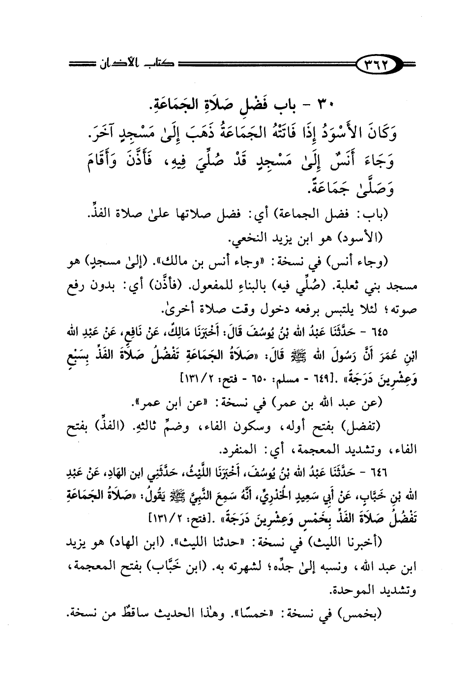 وَكَانَ الأَسْوَدُ: "إِذَا فَاتَتْهُ الجَمَاعَةُ ذَهَبَ إِلَى مَسْجِدٍ آخَرَ" وَجَاءَ أَنَسُ بْنُ مَالِكٍ: "إِلَى مَسْجِدٍ قَدْ صُلِّيَ فِيهِ، فَأَذَّنَ وَأَقَامَ وَصَلَّى جَمَاعَةً".