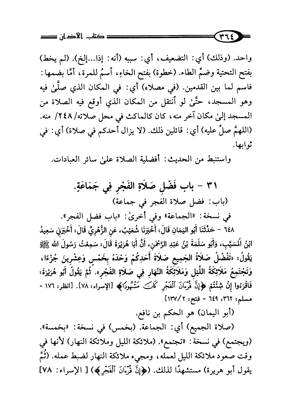 648 - حَدَّثَنَا أَبُو اليَمَانِ، قَالَ: أَخْبَرَنَا شُعَيْبٌ، عَنِ الزُّهْرِيِّ، قَالَ: أَخْبَرَنِي سَعِيدُ بْنُ المُسَيِّبِ، وَأَبُو سَلَمَةَ بْنُ عَبْدِ الرَّحْمَنِ، أَنَّ أَبَا هُرَيْرَةَ، قَالَ: سَمِعْتُ رَسُولَ اللَّهِ صَلَّى اللهُ عَلَيْهِ وَسَلَّمَ يَقُولُ: "تَفْضُلُ صَلاةُ الجَمِيعِ صَلاةَ أَحَدِكُمْ وَحْدَهُ، بِخَمْسٍ وَعِشْرِينَ جُزْءًا، وَتَجْتَمِعُ مَلائِكَةُ اللَّيْلِ وَمَلائِكَةُ النَّهَارِ فِي صَلاةِ الفَجْرِ" ثُمَّ يَقُولُ أَبُو هُرَيْرَةَ: فَاقْرَءُوا إِنْ شِئْتُمْ: {إِنَّ قُرْآنَ الفَجْرِ كَانَ مَشْهُودًا} [الإسراء: 78] انظر: 176 - مسلم: 362، 649 - فتح: 2/ 137]