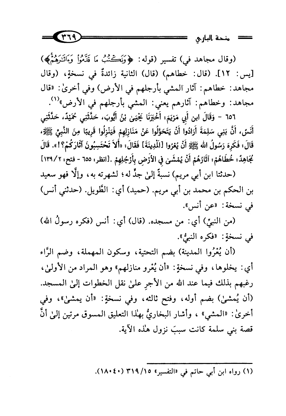 656 - وَقَالَ ابْنُ أَبِي مَرْيَمَ: أَخْبَرَنَا يَحْيَى بْنُ أَيُّوبَ، حَدَّثَنِي حُمَيْدٌ، حَدَّثَنِي أَنَسٌ: أَنَّ بَنِي سَلِمَةَ أَرَادُوا أَنْ يَتَحَوَّلُوا عَنْ مَنَازِلِهِمْ فَيَنْزِلُوا قَرِيبًا مِنَ النَّبِيِّ صَلَّى اللهُ عَلَيْهِ وَسَلَّمَ، قَالَ: فَكَرِهَ رَسُولُ اللَّهِ صَلَّى اللهُ عَلَيْهِ وَسَلَّمَ أَنْ يُعْرُوا المَدِينَةَ، فَقَالَ: "أَلا تَحْتَسِبُونَ آثَارَكُمْ" قَالَ مُجَاهِدٌ: "خُطَاهُمْ آثَارُهُمْ، أَنْ يُمْشَى فِي الأَرْضِ بِأَرْجُلِهِمْ".