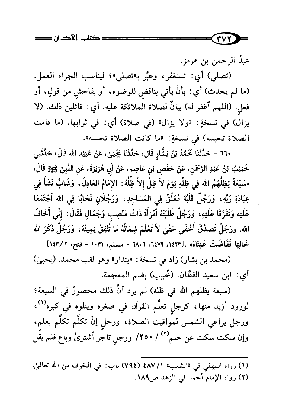 660 - حَدَّثَنَا مُحَمَّدُ بْنُ بَشَّارٍ بُنْدَارٌ، قَالَ: حَدَّثَنَا يَحْيَى، عَنْ عُبَيْدِ اللَّهِ، قَالَ: حَدَّثَنِي خُبَيْبُ بْنُ عَبْدِ الرَّحْمَنِ، عَنْ حَفْصِ بْنِ عَاصِمٍ، عَنْ أَبِي هُرَيْرَةَ، عَنِ النَّبِيِّ صَلَّى اللهُ عَلَيْهِ وَسَلَّمَ قَالَ: "سَبْعَةٌ يُظِلُّهُمُ اللَّهُ فِي ظِلِّهِ، يَوْمَ لَا ظِلَّ إلا ظِلُّهُ: الإِمَامُ العَادِلُ، وَشَابٌّ نَشَأَ فِي عِبَادَةِ رَبِّهِ، وَرَجُلٌ قَلْبُهُ مُعَلَّقٌ فِي المَسَاجِدِ، وَرَجُلانِ تَحَابَّا فِي اللَّهِ اجْتَمَعَا عَلَيْهِ وَتَفَرَّقَا عَلَيْهِ، وَرَجُلٌ طَلَبَتْهُ امْرَأَةٌ ذَاتُ مَنْصِبٍ وَجَمَالٍ، فَقَالَ: إِنِّي أَخَافُ اللَّهَ، وَرَجُلٌ تَصَدَّقَ، أَخْفَى حَتَّى لَا تَعْلَمَ شِمَالُهُ مَا تُنْفِقُ يَمِينُهُ، وَرَجُلٌ ذَكَرَ اللَّهَ خَالِيًا فَفَاضَتْ عَيْنَاهُ".