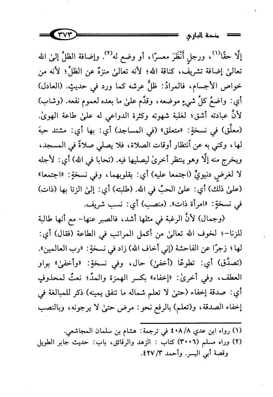 إلَّا حقًّا (¬1)، ورجلٍ أَنْظَرَ معسرًا، أو وضع له (¬2). وإضافة الظلِّ إلى الله تعالى إضافة تشريف، كناقة الله؛ لأنه تعالى منزهٌ عن الظلِّ؛ لأنه من خواص الأجسام، فالمرادُ: ظل عرشه كما ورد في حديثٍ. (العادل) أي: واضعُ كلِّ شيءٍ موضعه، وقدِّم على ما بعده لعموم نفعه. (وشاب) لأنَّ عبادته أشق؛ لغلبة شهوته وكثرة الدواعي له على طاعة الهوى. (معلَّق) في نسخةٍ: "متعلق" (في المساجد) أي: بها أي: مشتد حبه لهما، وكني به عن انتظار أوقات الصلاة، فلا يصلي صلاةً في المسجد، ويخرج منه إلا وهو ينتظر أخرى ليصليها فيه. (تحابا في الله) أي: لأجله لا لغرضٍ دنيوي (اجتمعا عليه) أي: بقلوبهما، وفي نسخةٍ: "اجتمعا" (على ذلك) أي: على الحبِّ في الله. (طلبته) أي: إلى الزنا بها (ذات) في نسخةٍ: "امرأة ذات". (منصب) أي: نسب شريف.