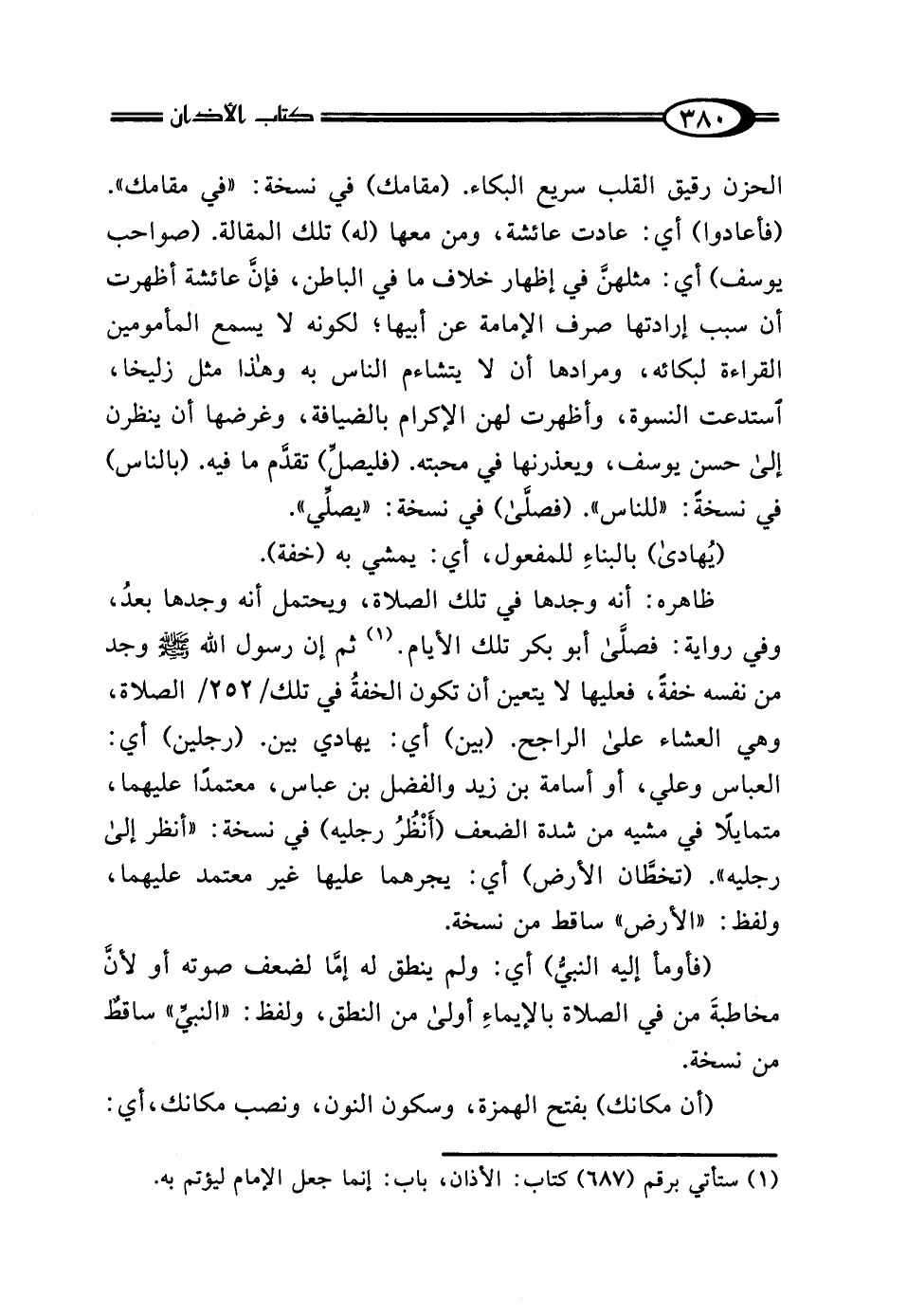 الحزن رقيق القلب سريع البكاء. (مقامك) في نسخة: "في مقامك". (فأعادوا) أي: عادت عائشة، ومن معها (له) تلك المقالة. (صواحب يوسف) أي: مثلهنَّ في إظهار خلاف ما في الباطن، فإن عائشة أظهرت أن سبب إرادتها صرف الإمامة عن أبيها؛ لكونه لا يسمع المأمومين القراءة لبكائه، ومرادها أن لا يتشاءم الناس به وهذا مثل زليخا، استدعت النسوة، وأظهرت لهن الإكرام بالضيافة، وغرضها أن ينظرن إلى حسن يوسف، ويعذرنها في محبته. (فليصل) تقدم ما فيه. (بالناس) في نسخةٍ: "للناس". (فصلى) في نسخة: "يصلي".