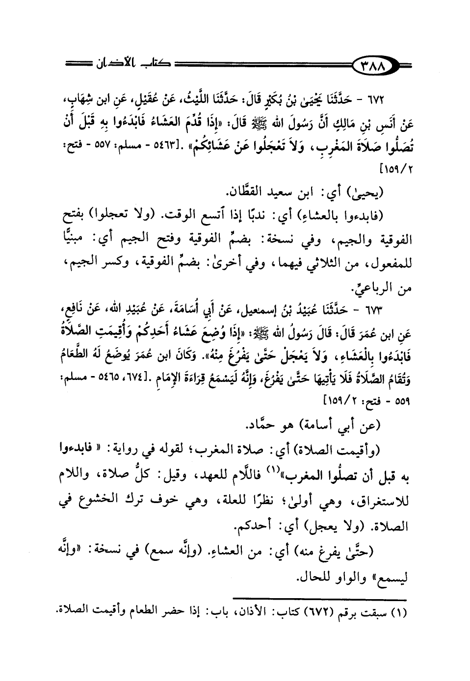 673 - حَدَّثَنَا عُبَيْدُ بْنُ إِسْمَاعِيلَ، عَنْ أَبِي أُسَامَةَ، عَنْ عُبَيْدِ اللَّهِ، عَنْ نَافِعٍ، عَنِ ابْنِ عُمَرَ، قَالَ: قَالَ رَسُولُ اللَّهِ صَلَّى اللهُ عَلَيْهِ وَسَلَّمَ: "إِذَا وُضِعَ عَشَاءُ أَحَدِكُمْ وَأُقِيمَتِ الصَّلاةُ، فَابْدَءُوا بِالعَشَاءِ وَلَا يَعْجَلْ حَتَّى يَفْرُغَ مِنْهُ" وَكَانَ ابْنُ عُمَرَ: "يُوضَعُ لَهُ الطَّعَامُ، وَتُقَامُ الصَّلاةُ، فَلَا يَأْتِيهَا حَتَّى يَفْرُغَ، وَإِنَّهُ لَيَسْمَعُ قِرَاءَةَ الإِمَامِ".