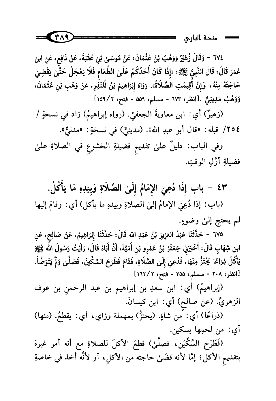 674 - وَقَالَ زُهَيْرٌ، وَوَهْبُ بْنُ عُثْمَانَ، عَنْ مُوسَى بْنِ عُقْبَةَ، عَنْ نَافِعٍ، عَنْ ابْنِ عُمَرَ، قَالَ: قَالَ النَّبِيُّ صَلَّى اللهُ عَلَيْهِ وَسَلَّمَ: "إِذَا كَانَ أَحَدُكُمْ عَلَى الطَّعَامِ، فَلَا يَعْجَلْ حَتَّى يَقْضِيَ حَاجَتَهُ مِنْهُ، وَإِنْ أُقِيمَتِ الصَّلاةُ"، رَوَاهُ إِبْرَاهِيمُ بْنُ المُنْذِرِ، عَنْ وَهْبِ بْنِ عُثْمَانَ "وَوَهْبٌ مَدِينِيٌّ".