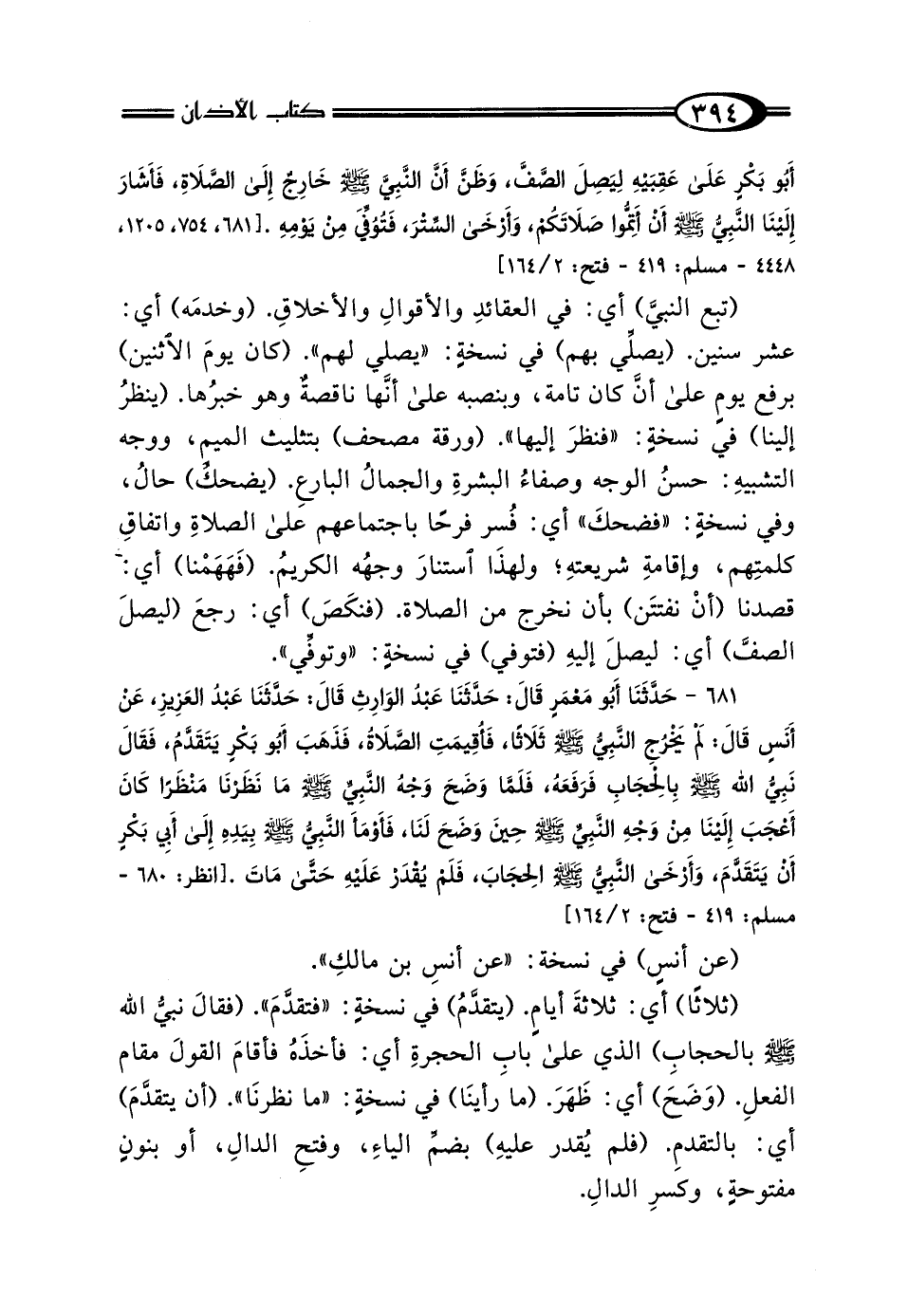 (تبع النبي) أي: في العقائدِ والأقوالِ والأخلاقِ. (وخدمَه) أي: عشر سنين. (يصلي بهم) في نسخةٍ: "يصلي لهم". (كان يومَ الاثنين) برفع يومٍ على أنَّ كان تامة، وبنصبه على أنَّها ناقصةٌ وهو خبرُها. (ينظرُ إلينا) في نسخةٍ: "فنظرَ إليها". (ورقة مصحف) بتثليث الميم، ووجه التشبيهِ: حسنُ الوجه وصفاءُ البشرةِ والجمالُ البارعِ. (يضحك) حالُ، وفي نسخةٍ: "فضحكَ" أي: فُسر فرحًا باجتماعهم على الصلاةِ واتفاقِ كلمتِهم، وإقامةِ شريعتهِ؛ ولهذَا استنارَ وجهُه الكريمُ. (فَهَهَمْنا) أي: قصدنا (أنْ نفتتَن) بأن نخرج من الصلاة. (فنكَصَ) أي: رجعَ (ليصلَ الصفَّ) أي: ليصلَ إليهِ (فتوفي) في نسخةٍ: "وتوفي ".