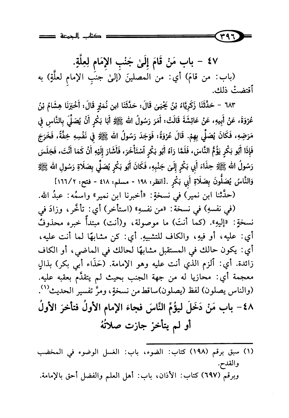 683 - حَدَّثَنَا زَكَرِيَّاءُ بْنُ يَحْيَى، قَال: حَدَّثَنَا ابْنُ نُمَيْرٍ، قَال: أَخْبَرَنَا هِشَامُ بْنُ عُرْوَةَ، عَنْ أَبِيهِ، عَنْ عَائِشَةَ، قَالتْ: "أَمَرَ رَسُولُ اللَّهِ صَلَّى اللهُ عَلَيْهِ وَسَلَّمَ أَبَا بَكْرٍ أَنْ يُصَلِّيَ بِالنَّاسِ فِي مَرَضِهِ"، فَكَانَ يُصَلِّي بِهِمْ، قَال عُرْوَةُ: فَوَجَدَ رَسُولُ اللَّهِ صَلَّى اللهُ عَلَيْهِ وَسَلَّمَ فِي نَفْسِهِ خِفَّةً، فَخَرَجَ، فَإِذَا أَبُو بَكْرٍ يَؤُمُّ النَّاسَ، فَلَمَّا رَآهُ أَبُو بَكْرٍ اسْتَأْخَرَ، فَأَشَارَ إِلَيْهِ: "أَنْ كَمَا أَنْتَ"، فَجَلَسَ رَسُولُ اللَّهِ صَلَّى اللهُ عَلَيْهِ وَسَلَّمَ حِذَاءَ أَبِي بَكْرٍ إِلَى جَنْبِهِ، فَكَانَ أَبُو بَكْرٍ يُصَلِّي بِصَلاةِ رَسُولِ اللَّهِ صَلَّى اللهُ عَلَيْهِ وَسَلَّمَ وَالنَّاسُ يُصَلُّونَ بِصَلاةِ أَبِي بَكْرٍ".