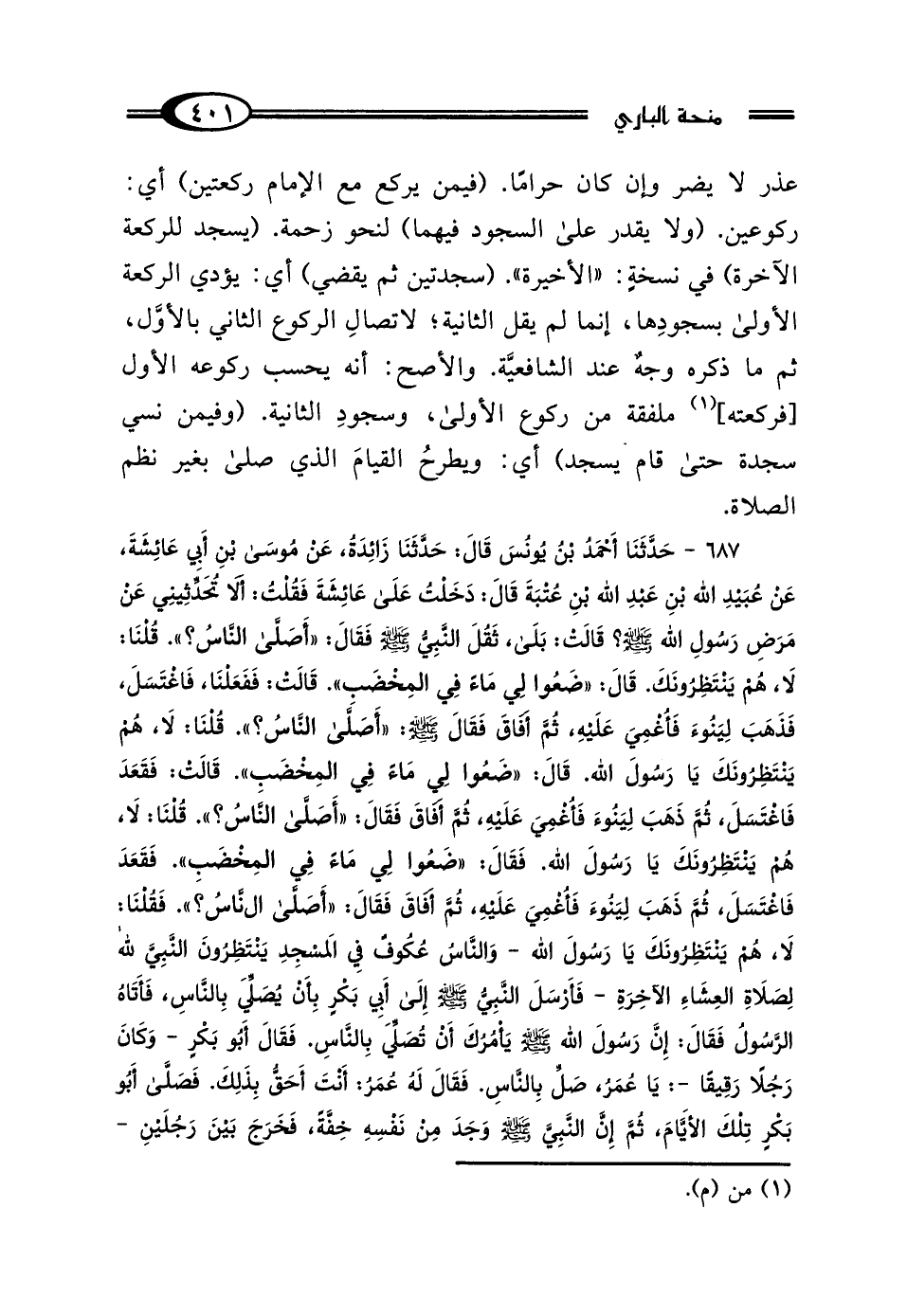 687 - حَدَّثَنَا أَحْمَدُ بْنُ يُونُسَ، قَال: حَدَّثَنَا زَائِدَةُ، عَنْ مُوسَى بْنِ أَبِي عَائِشَةَ، عَنْ عُبَيْدِ اللَّهِ بْنِ عَبْدِ اللَّهِ بْنِ عُتْبَةَ، قَال: دَخَلْتُ عَلَى عَائِشَةَ فَقُلْتُ: أَلا تُحَدِّثِينِي عَنْ مَرَضِ رَسُولِ اللَّهِ صَلَّى اللهُ عَلَيْهِ وَسَلَّمَ؟ قَالتْ: بَلَى، ثَقُلَ النَّبِيُّ صَلَّى اللهُ عَلَيْهِ وَسَلَّمَ فَقَال: "أَصَلَّى النَّاسُ؟ " قُلْنَا: لَا، هُمْ يَنْتَظِرُونَكَ، قَال: "ضَعُوا لِي مَاءً فِي المِخْضَبِ". قَالتْ: فَفَعَلْنَا، فَاغْتَسَلَ، فَذَهَبَ لِيَنُوءَ فَأُغْمِيَ عَلَيْهِ، ثُمَّ أَفَاقَ، فَقَال صَلَّى اللهُ عَلَيْهِ وَسَلَّمَ: "أَصَلَّى النَّاسُ؟ " قُلْنَا: لَا، هُمْ يَنْتَظِرُونَكَ يَا رَسُولَ اللَّهِ، قَال: "ضَعُوا لِي مَاءً فِي المِخْضَبِ" قَالتْ: فَقَعَدَ فَاغْتَسَلَ، ثُمَّ ذَهَبَ لِيَنُوءَ فَأُغْمِيَ عَلَيْهِ، ثُمَّ أَفَاقَ، فَقَال: "أَصَلَّى النَّاسُ؟ " قُلْنَا: لَا، هُمْ يَنْتَظِرُونَكَ يَا رَسُولَ اللَّهِ، فَقَال: "ضَعُوا لِي مَاءً فِي المِخْضَبِ"، فَقَعَدَ، فَاغْتَسَلَ، ثُمَّ ذَهَبَ لِيَنُوءَ فَأُغْمِيَ عَلَيْهِ، ثُمَّ أَفَاقَ فَقَال: "أَصَلَّى النَّاسُ؟ " فَقُلْنَا: لَا، هُمْ يَنْتَظِرُونَكَ يَا رَسُولَ اللَّهِ، وَالنَّاسُ عُكُوفٌ فِي المَسْجِدِ، يَنْتَظِرُونَ النَّبِيَّ عَلَيْهِ السَّلامُ لِصَلاةِ العِشَاءِ الآخِرَةِ، فَأَرْسَلَ النَّبِيُّ صَلَّى اللهُ عَلَيْهِ وَسَلَّمَ إِلَى أَبِي بَكْرٍ بِأَنْ يُصَلِّيَ بِالنَّاسِ، فَأَتَاهُ الرَّسُولُ فَقَال: إِنَّ رَسُولَ اللَّهِ صَلَّى اللهُ عَلَيْهِ وَسَلَّمَ يَأْمُرُكَ أَنْ تُصَلِّيَ بِالنَّاسِ، فَقَال أَبُو بَكْرٍ - وَكَانَ رَجُلًا رَقِيقًا -: يَا عُمَرُ صَلِّ بِالنَّاسِ، فَقَال لَهُ عُمَرُ: أَنْتَ أَحَقُّ بِذَلِكَ، فَصَلَّى أَبُو بَكْرٍ تِلْكَ الأَيَّامَ، ثُمَّ إِنَّ النَّبِيَّ صَلَّى اللهُ عَلَيْهِ وَسَلَّمَ وَجَدَ مِنْ نَفْسِهِ خِفَّةً، فَخَرَجَ بَيْنَ رَجُلَيْنِ
