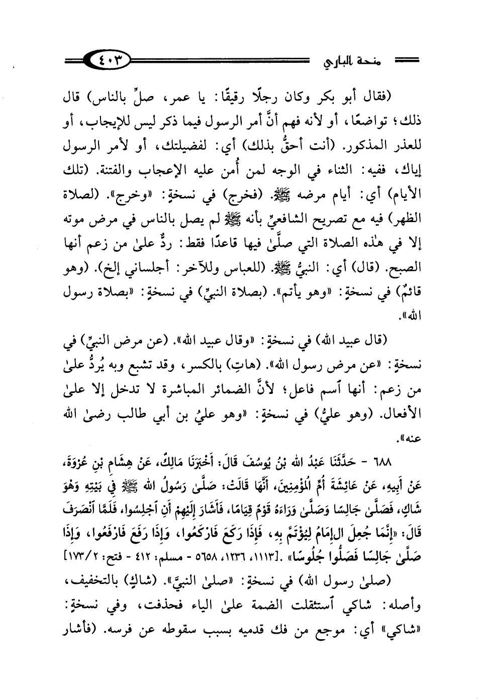 (فقال أبو بكر وكان رجلًا رقيقًا: يا عمر، صلِّ بالناس) قال ذلك؛ تواضعًا، أو لأنه فهم أنَّ أمر الرسول فيما ذكر ليس للإيجاب، أو للعذر المذكور. (أنت أحقُّ بذلك) أي: لفضيلتك، أو لأمر الرسول إياك، ففيه: الثناء في الوجه لمن أُمن عليه الإعجاب والفتنة. (تلك الأيام) أي: أيام مرضه - صلى الله عليه وسلم -. (فخرج) في نسخةٍ: "وخرج". (لصلاة الظهر) فيه مع تصريح الشافعيِّ بأنه - صلى الله عليه وسلم - لم يصل بالناس في مرض موته إلا في هذه الصلاة التي صلى فيها قاعدًا فقط: ردٌّ على من زعم أنها الصبح. (قال) أي: النبيُّ - صلى الله عليه وسلم -. (للعباس وللآخر: أجلساني إلخ). (وهو قائمٌ) في نسخةٍ: "وهو يأتم". (بصلاة النبي) في نسخةٍ: "بصلاة رسول الله".