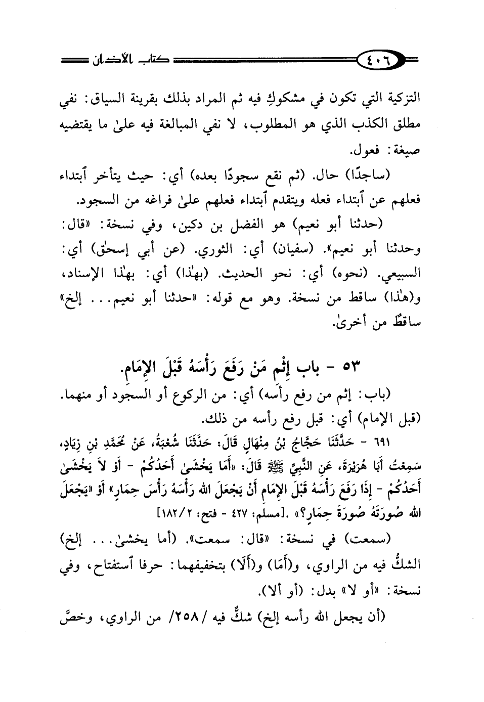 691 - حَدَّثَنَا حَجَّاجُ بْنُ مِنْهَالٍ، قَال: حَدَّثَنَا شُعْبَةُ، عَنْ مُحَمَّدِ بْنِ زِيَادٍ، سَمِعْتُ أَبَا هُرَيْرَةَ، عَنِ النَّبِيِّ صَلَّى اللهُ عَلَيْهِ وَسَلَّمَ قَال: "أَمَا يَخْشَى أَحَدُكُمْ - أَوْ: لَا يَخْشَى أَحَدُكُمْ - إِذَا رَفَعَ رَأْسَهُ قَبْلَ الإِمَامِ، أَنْ يَجْعَلَ اللَّهُ رَأْسَهُ رَأْسَ حِمَارٍ، أَوْ يَجْعَلَ اللَّهُ صُورَتَهُ صُورَةَ حِمَارٍ".