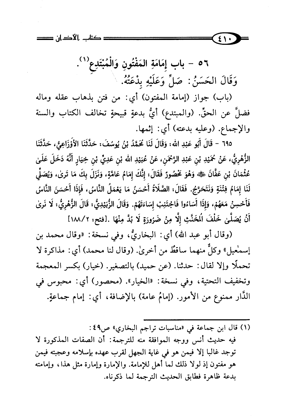 695 - قَال أَبُو عَبْدِ اللَّهِ: وَقَال لَنَا مُحَمَّدُ بْنُ يُوسُفَ، حَدَّثَنَا الأَوْزَاعِيُّ، حَدَّثَنَا الزُّهْرِيُّ، عَنْ حُمَيْدِ بْنِ عَبْدِ الرَّحْمَنِ، عَنْ عُبَيْدِ اللَّهِ بْنِ عَدِيِّ بْنِ خِيَارٍ، أَنَّهُ دَخَلَ عَلَى عُثْمَانَ بْنِ عَفَّانَ رَضِيَ اللَّهُ عَنْهُ، - وَهُوَ مَحْصُورٌ - فَقَال: إِنَّكَ إِمَامُ عَامَّةٍ، وَنَزَلَ بِكَ مَا نَرَى، وَيُصَلِّي لَنَا إِمَامُ فِتْنَةٍ، وَنَتَحَرَّجُ؟ فَقَال: "الصَّلاةُ أَحْسَنُ مَا يَعْمَلُ النَّاسُ، فَإِذَا أَحْسَنَ النَّاسُ، فَأَحْسِنْ مَعَهُمْ، وَإِذَا أَسَاءُوا فَاجْتَنِبْ إِسَاءَتَهُمْ" وَقَال الزُّبَيْدِيُّ، قَال: الزُّهْرِيُّ: "لَا نَرَى أَنْ يُصَلَّى خَلْفَ المُخَنَّثِ إلا مِنْ ضَرُورَةٍ لَا بُدَّ مِنْهَا".