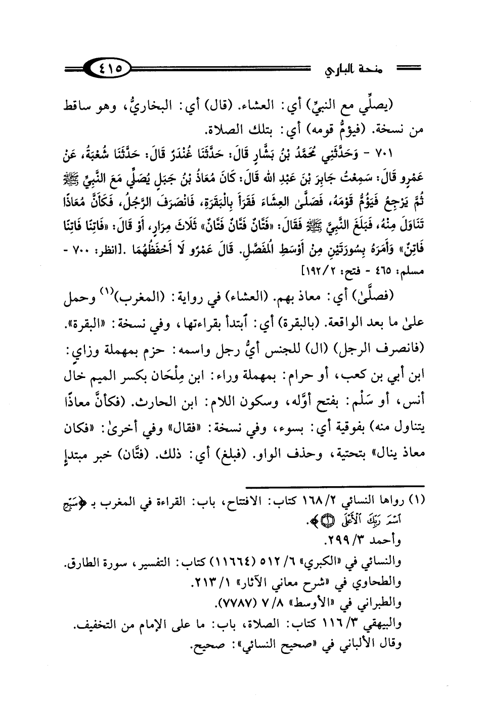 701 - حَدَّثَنِي مُحَمَّدُ بْنُ بَشَّارٍ، قَال: حَدَّثَنَا غُنْدَرٌ، قَال: حَدَّثَنَا شُعْبَةُ، عَنْ عَمْرٍو، قَال: سَمِعْتُ جَابِرَ بْنَ عَبْدِ اللَّهِ، قَال: كَانَ مُعَاذُ بْنُ جَبَلٍ يُصَلِّي مَعَ النَّبِيِّ صَلَّى اللهُ عَلَيْهِ وَسَلَّمَ، ثُمَّ يَرْجِعُ، فَيَؤُمُّ قَوْمَهُ، فَصَلَّى العِشَاءَ، فَقَرَأَ بِالْبَقَرَةِ، فَانْصَرَفَ الرَّجُلُ، فَكَأَنَّ مُعَاذًا تَنَاوَلَ مِنْهُ، فَبَلَغَ النَّبِيَّ صَلَّى اللهُ عَلَيْهِ وَسَلَّمَ فَقَال: "فَتَّانٌ، فَتَّانٌ، فَتَّانٌ" ثَلاثَ مِرَارٍ - أَوْ قَال: "فَاتِنًا، فَاتِنًا، فَاتِنًا" - وَأَمَرَهُ بِسُورَتَيْنِ مِنْ أَوْسَطِ المُفَصَّلِ، قَال عَمْرٌو: لَا أَحْفَظُهُمَا.