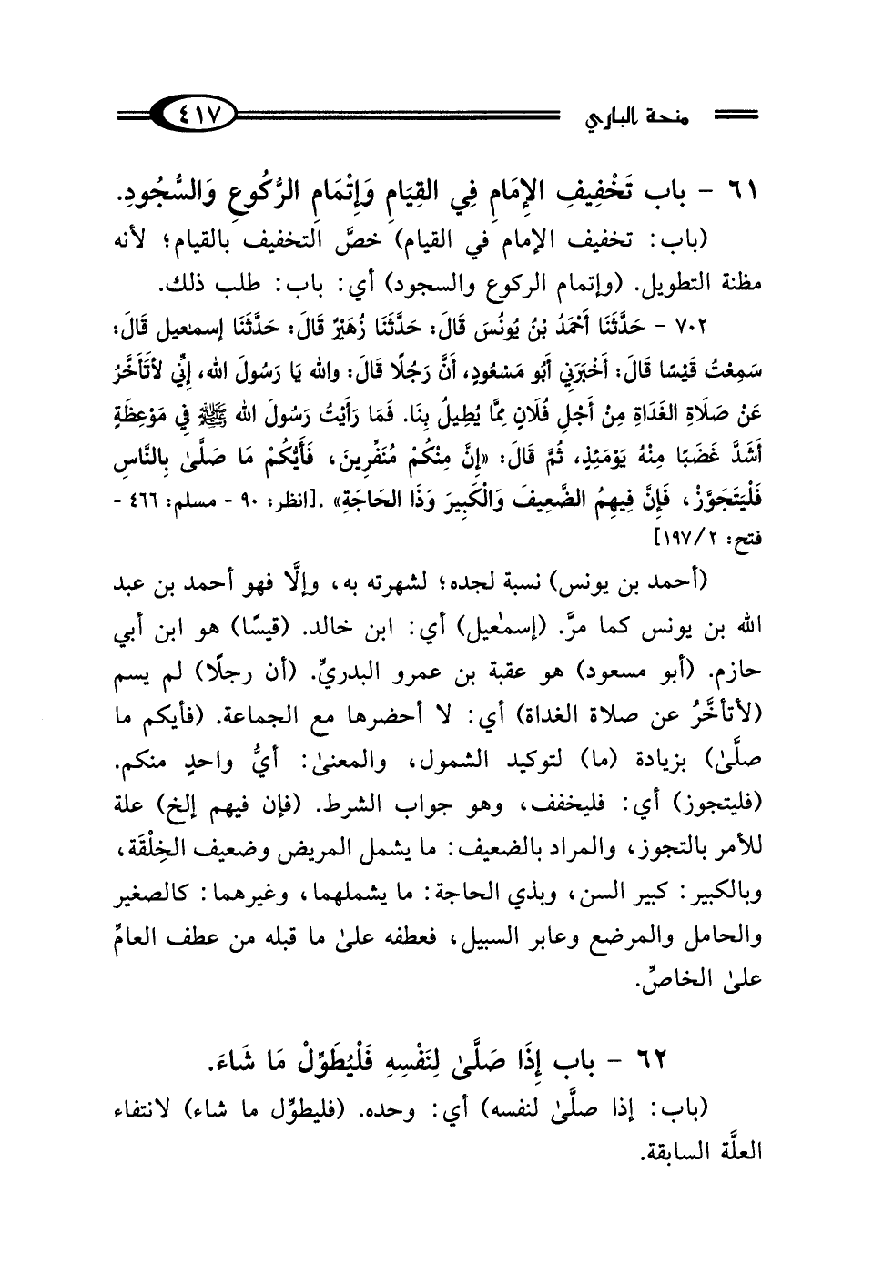 (أحمد بن يونس) نسبة لجده؛ لشهرته به، وإلَّا فهو أحمد بن عبد الله بن يونس كما مرَّ. (إسماعيل) أي: ابن خالد. (قيسًا) هو ابن أبي حازم. (أبو مسعود) هو عقبة بن عمرو البدريِّ. (أن رجلا) لم يسم (لأتأخَّرُ عن صلاة الغداة) أي: لا أحضرها مع الجماعة. (فأيكم ما صلَّى) بزيادة (ما) لتوكيد الشمول، والمعنى: أيُّ واحدٍ منكم. (فليتجوز) أي: فليخفف، وهو جواب الشرط. (فإن فيهم إلخ) علة للأمر بالتجوز، والمراد بالضعيف: ما يشمل المريض وضعيف الخِلْقَة، وبالكبير: كبير السن، وبذي الحاجة: ما يشملهما، وغيرهما: كالصغير والحامل والمرضع وعابر السبيل، فعطفه على ما قبله من عطف العامِّ على الخاصِّ.