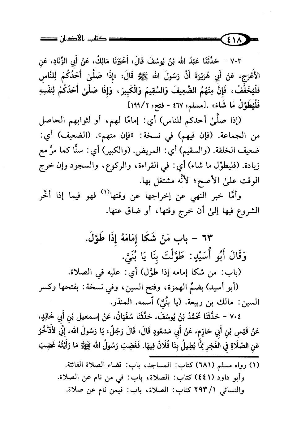 703 - حَدَّثَنَا عَبْدُ اللَّهِ بْنُ يُوسُفَ، قَال: أَخْبَرَنَا مَالِكٌ، عَنْ أَبِي الزِّنَادِ، عَنِ الأَعْرَجِ، عَنْ أَبِي هُرَيْرَةَ، أَنَّ رَسُولَ اللَّهِ صَلَّى اللهُ عَلَيْهِ وَسَلَّمَ قَال: "إِذَا صَلَّى أَحَدُكُمْ لِلنَّاسِ، فَلْيُخَفِّفْ، فَإِنَّ مِنْهُمُ الضَّعِيفَ وَالسَّقِيمَ وَالكَبِيرَ، وَإِذَا صَلَّى أَحَدُكُمْ لِنَفْسِهِ فَلْيُطَوِّلْ مَا شَاءَ".