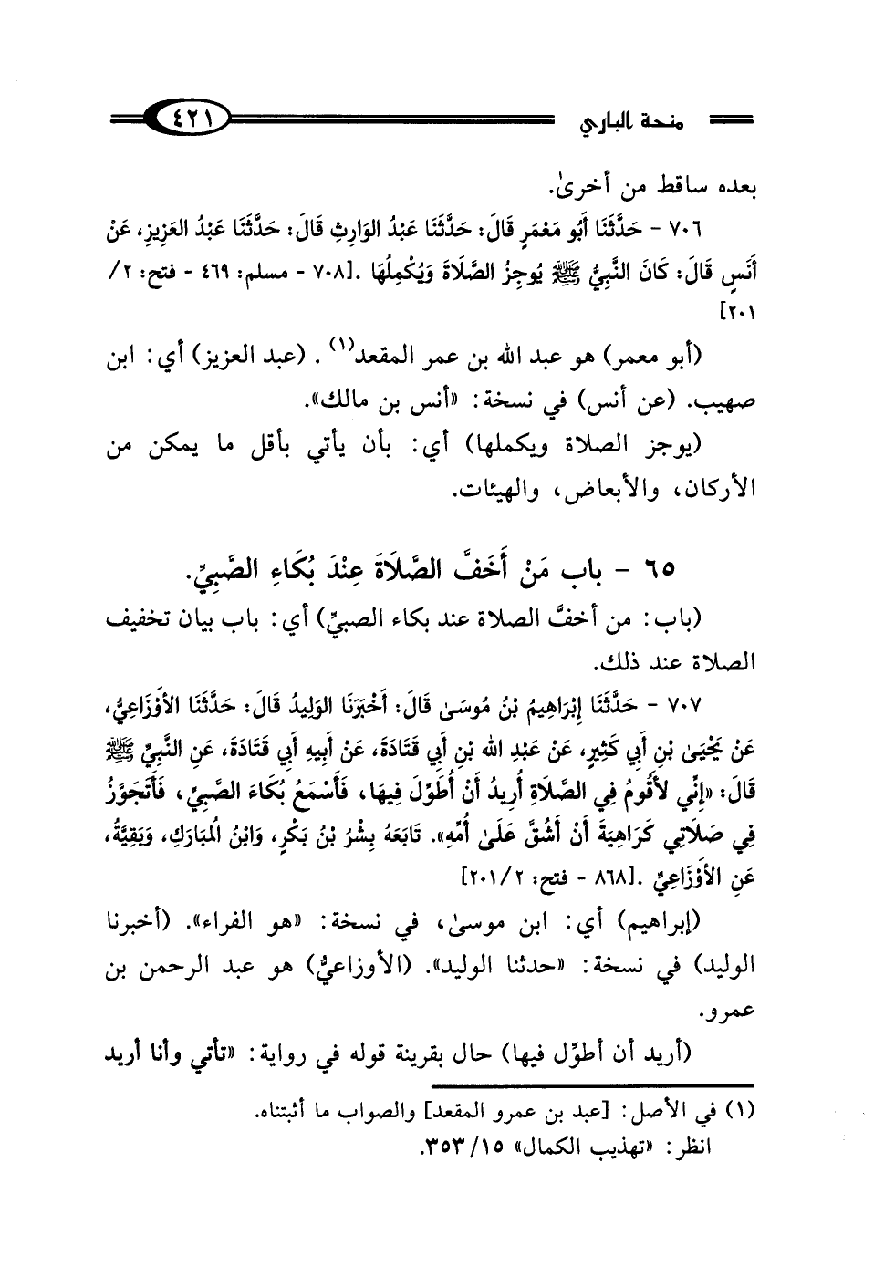 706 - حَدَّثَنَا أَبُو مَعْمَرٍ، قَال: حَدَّثَنَا عَبْدُ الوَارِثِ، قَال: حَدَّثَنَا عَبْدُ العَزِيزِ، عَنْ أَنَسِ بْنِ مَالِكٍ، قَال: "كَانَ النَّبِيُّ صَلَّى اللهُ عَلَيْهِ وَسَلَّمَ يُوجِزُ الصَّلاةَ وَيُكْمِلُهَا".