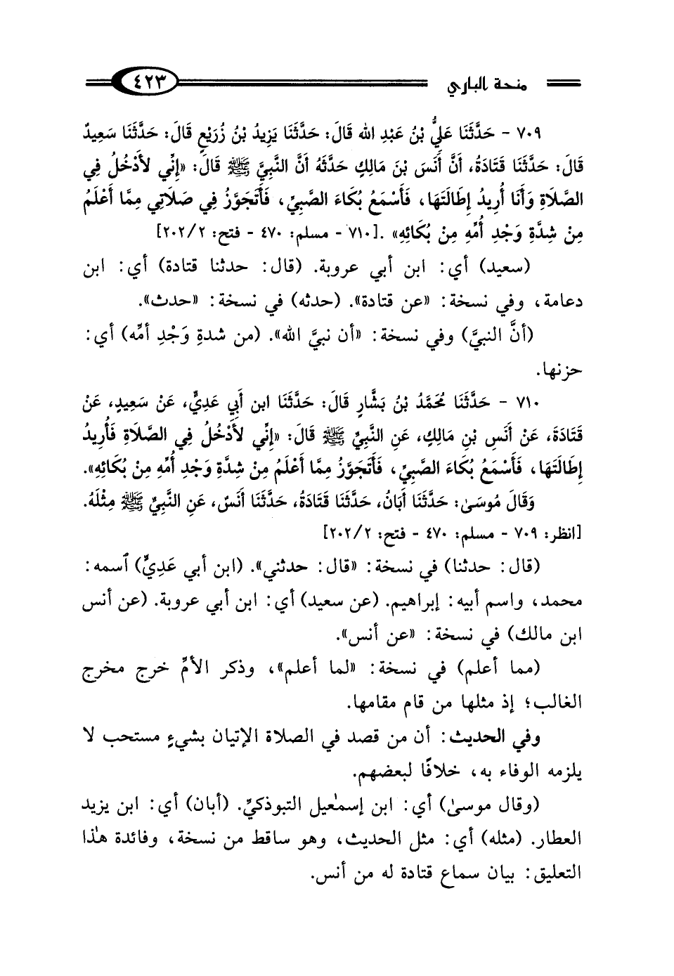 710 - حَدَّثَنَا مُحَمَّدُ بْنُ بَشَّارٍ، قَال: حَدَّثَنَا ابْنُ أَبِي عَدِيٍّ، عَنْ سَعِيدٍ، عَنْ قَتَادَةَ، عَنْ أَنَسِ بْنِ مَالِكٍ، عَنِ النَّبِيِّ صَلَّى اللهُ عَلَيْهِ وَسَلَّمَ قَال: "إِنِّي لَأَدْخُلُ فِي الصَّلاةِ، فَأُرِيدُ إِطَالتَهَا، فَأَسْمَعُ بُكَاءَ الصَّبِيِّ، فَأَتَجَوَّزُ مِمَّا أَعْلَمُ مِنْ شِدَّةِ وَجْدِ أُمِّهِ مِنْ بُكَائِهِ" وَقَال مُوسَى، حَدَّثَنَا أَبَانُ، حَدَّثَنَا قَتَادَةُ، حَدَّثَنَا أَنَسٌ، عَنِ النَّبِيِّ صَلَّى اللهُ عَلَيْهِ وَسَلَّمَ مِثْلَهُ.