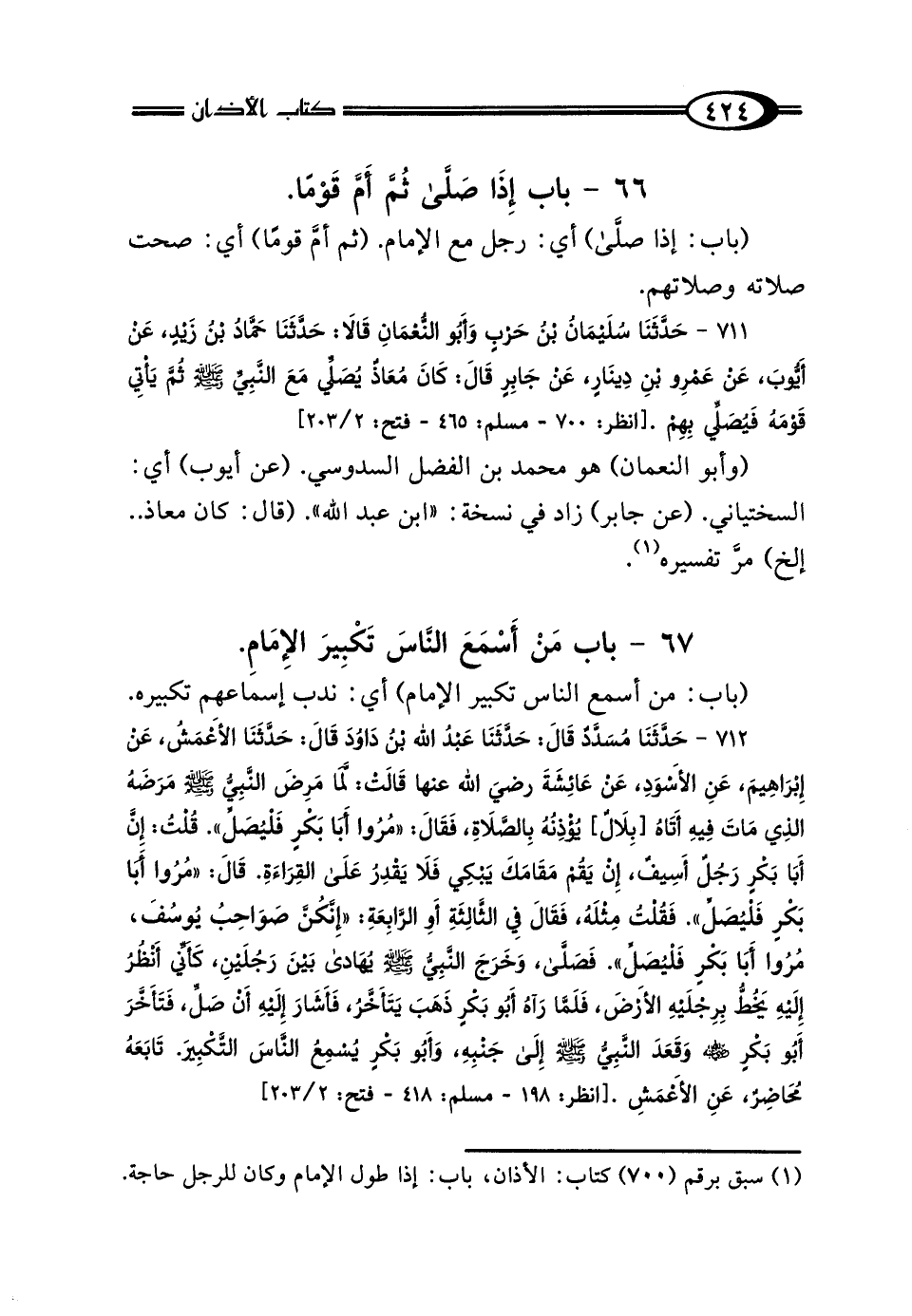 (وأبو النعمان) هو محمد بن الفضل السدوسي. (عن أيوب) أي: السختياني. (عن جابر) زاد في نسخة: "ابن عبد الله". (قال: كان معاذ .. إلخ) مرَّ تفسيره (¬1).