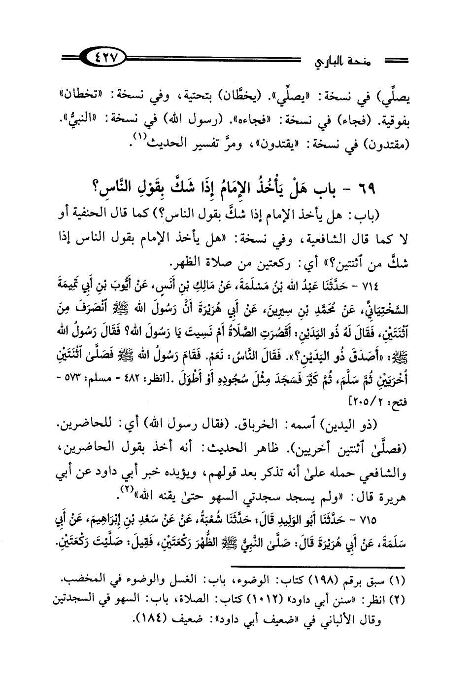 715 - حَدَّثَنَا أَبُو الوَلِيدِ، قَال: حَدَّثَنَا شُعْبَةُ، عَنْ سَعْدِ بْنِ إِبْرَاهِيمَ، عَنْ أَبِي سَلَمَةَ بْنِ عَبْدِ الرَّحْمَنِ، عَنْ أَبِي هُرَيْرَةَ، قَال: "صَلَّى النَّبِيُّ صَلَّى اللهُ عَلَيْهِ وَسَلَّمَ الظُّهْرَ رَكْعَتَيْنِ، فَقِيلَ: صَلَّيْتَ رَكْعَتَيْنِ،